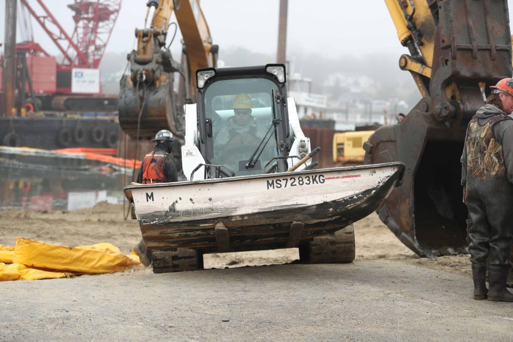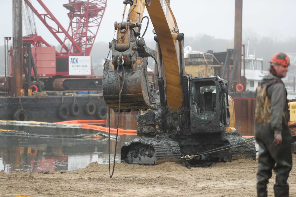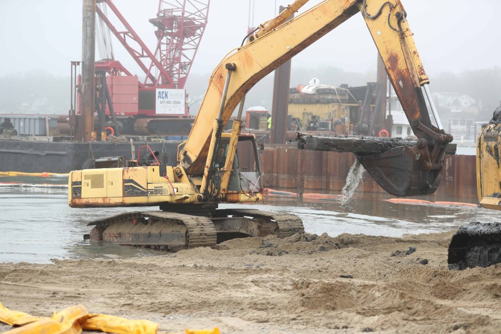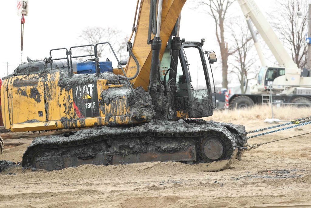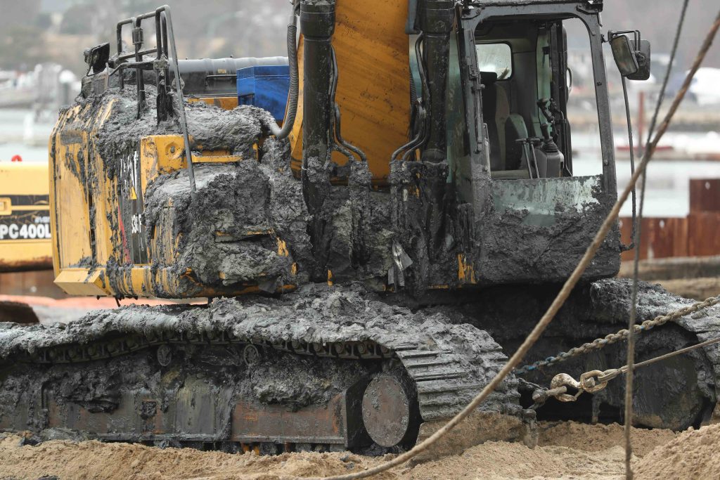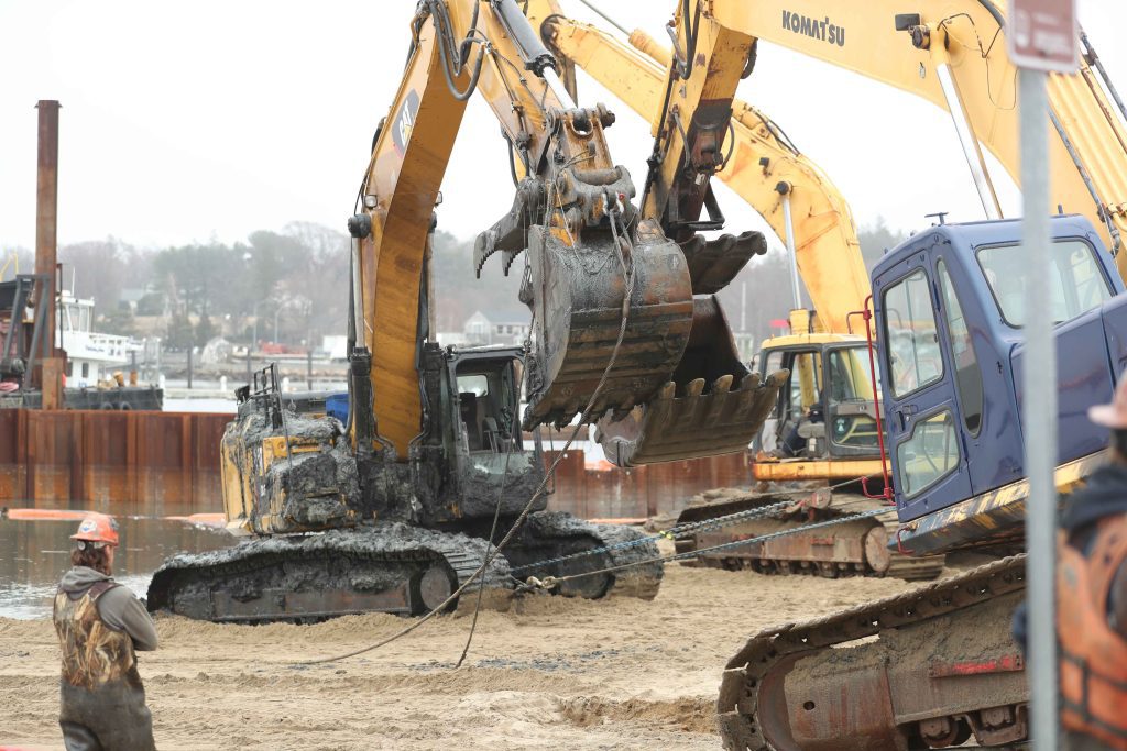 PHOTOS: Excavator Pulled from the Harbor March 19, 2022 - Photos by Joshua Ross Surrounded by a crowd of onlookers, crews used three tow trucks, two excavators, and one crane to get the semi-submerged excavator out of Higham Harbor on Saturday morning.