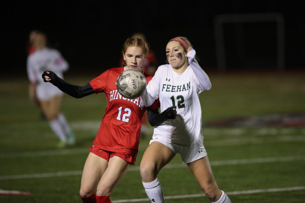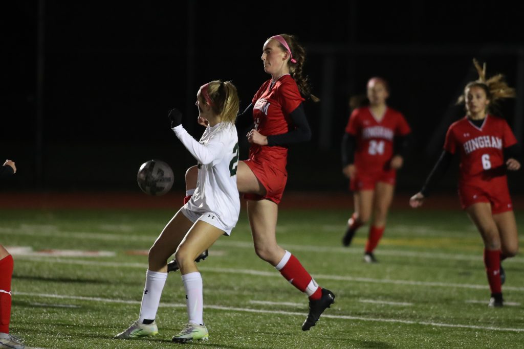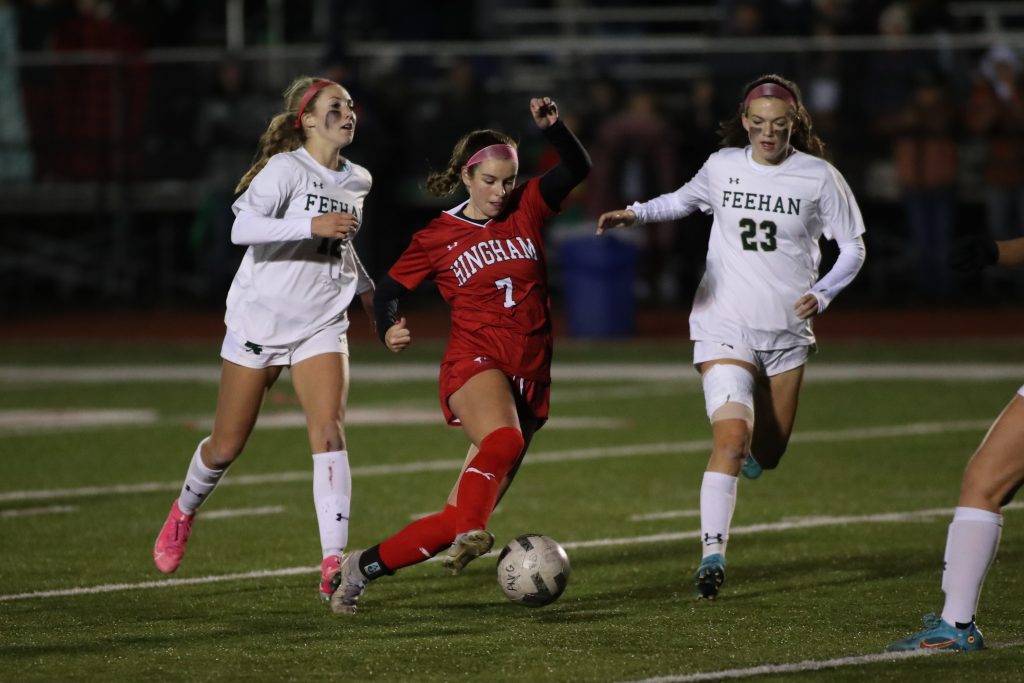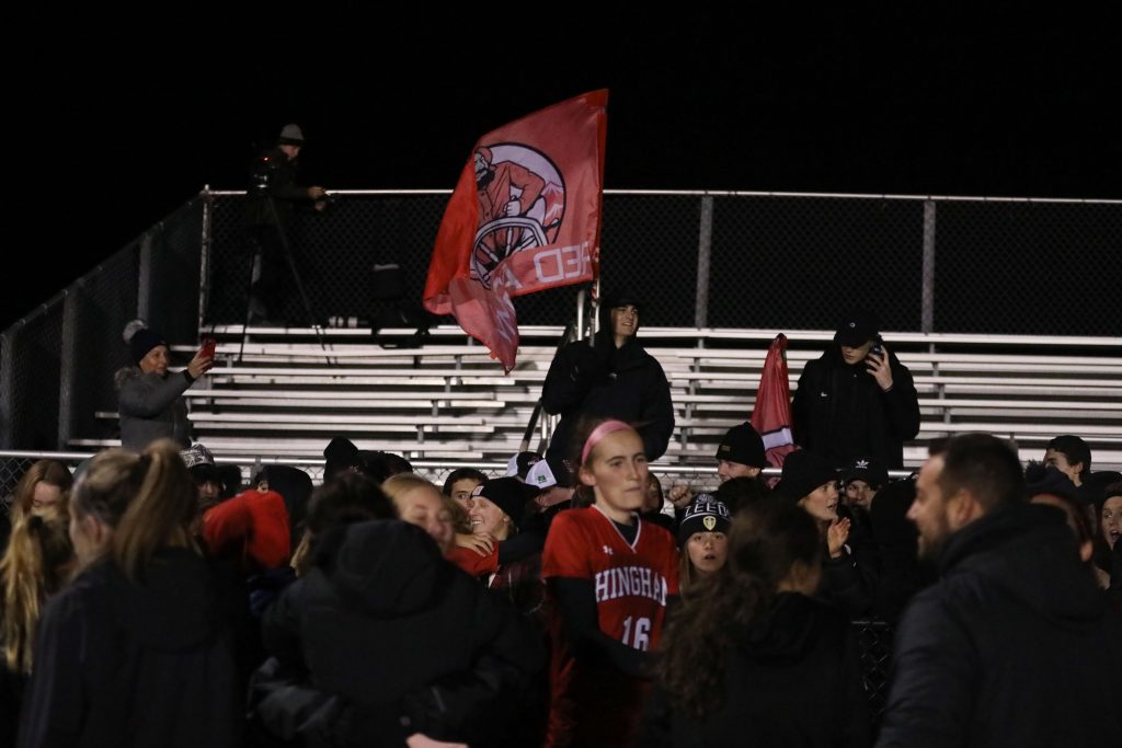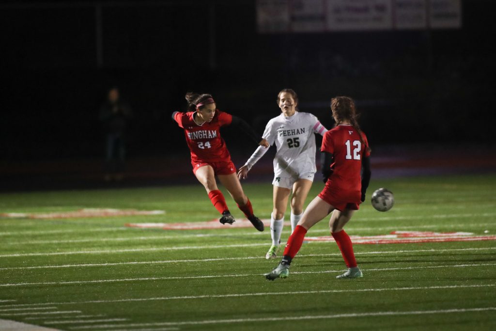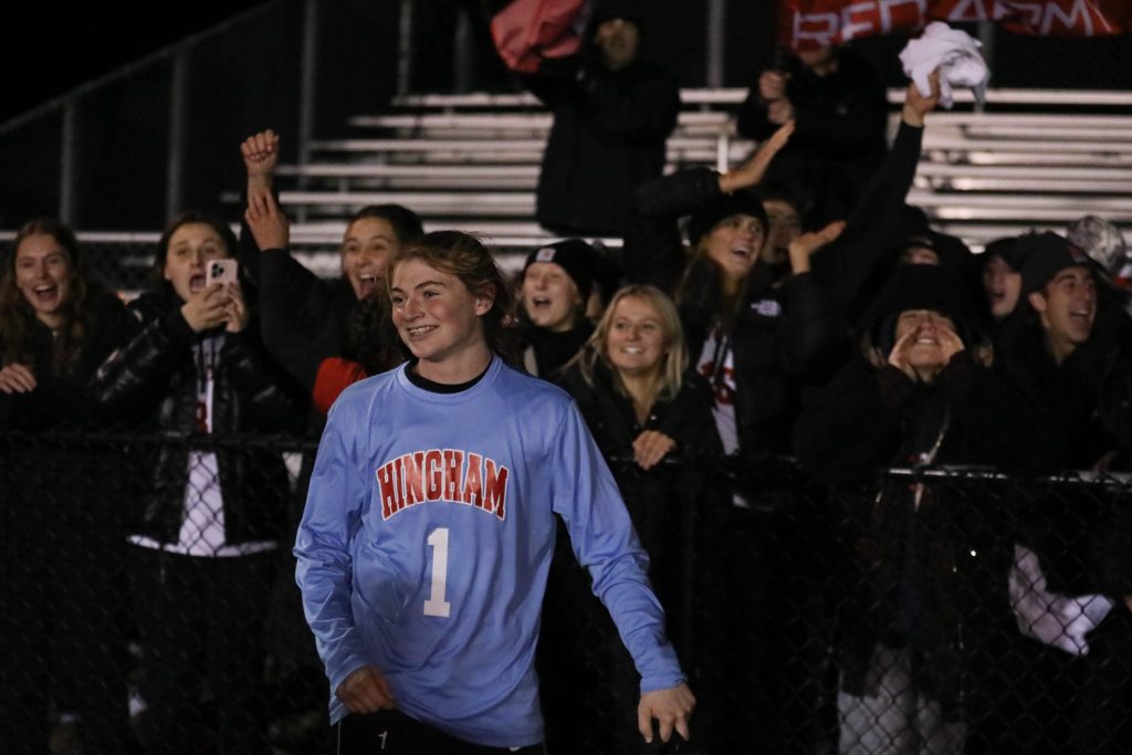After trailing for the first time this post season, senior caption Sophie Reale scored 18 minutes into the second half tying up the game against third seed Bishop Feehan. No more goals were scored in regulation or the 2 OT. Penalty shots were even 3-3 after 5 rounds when junior Ava Vahorlak put one in the bottom left corner of the net sending Hingham to the D1 State Championship on Saturday.