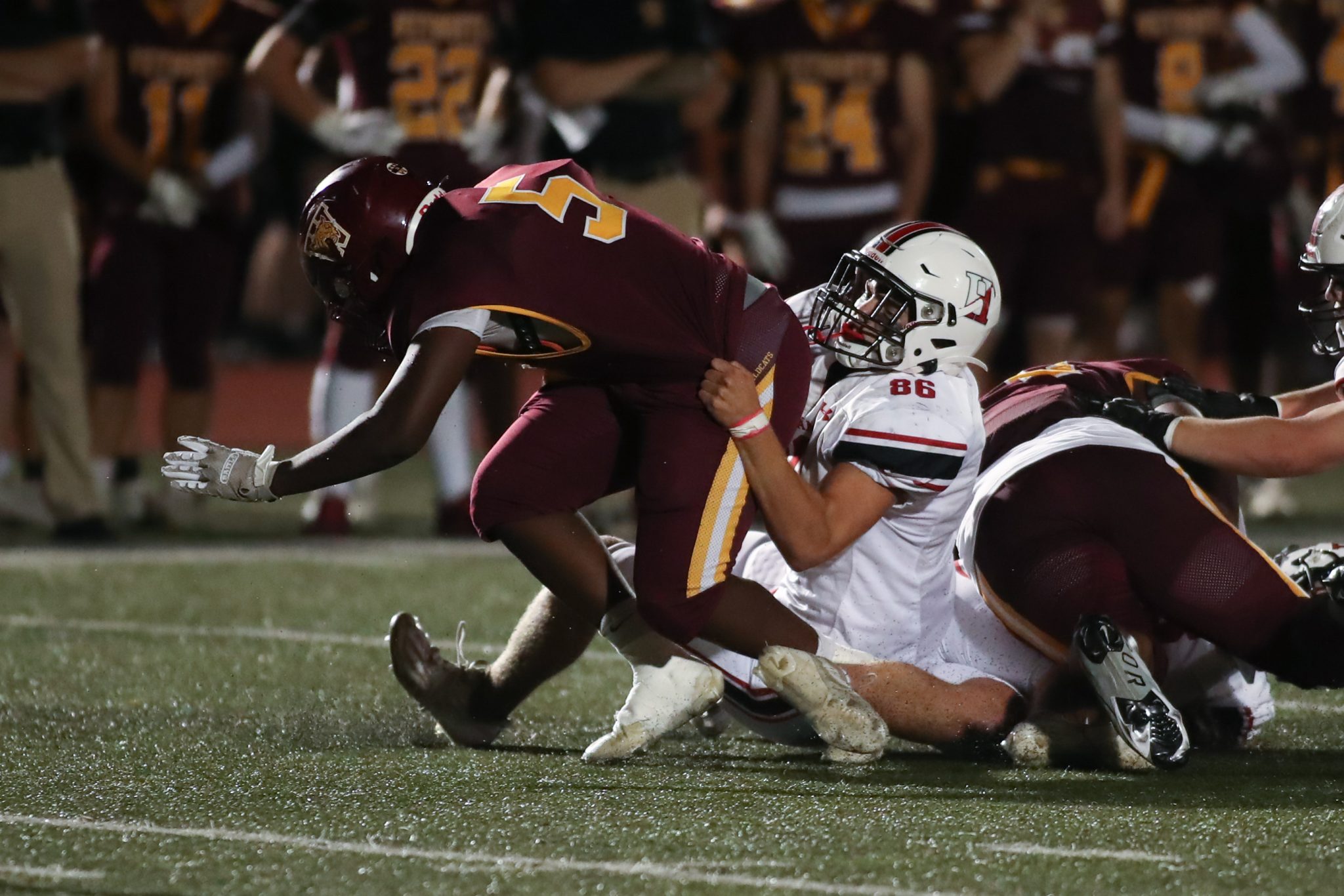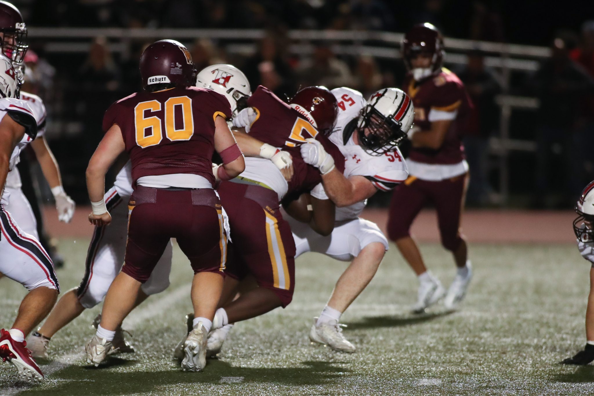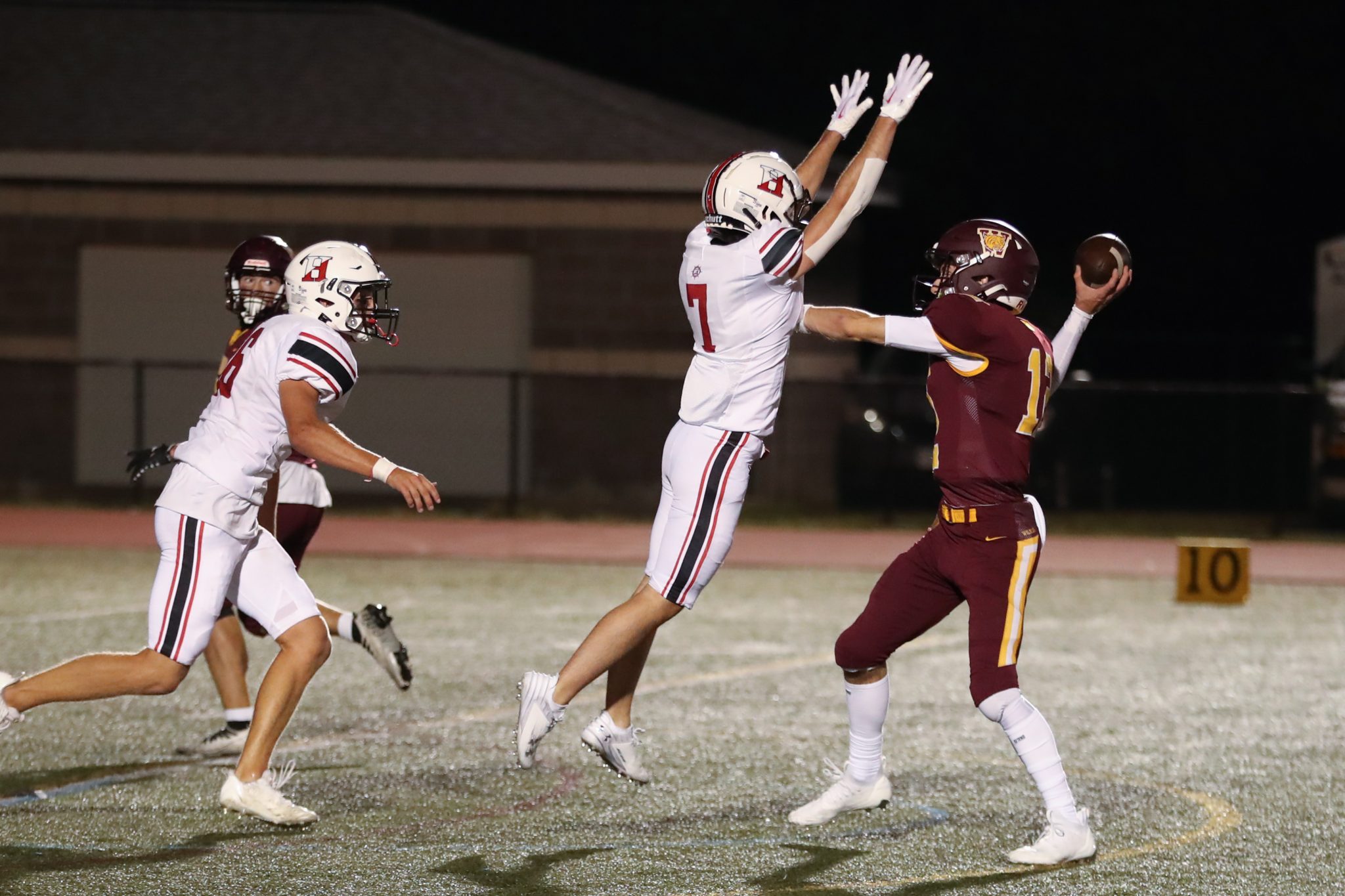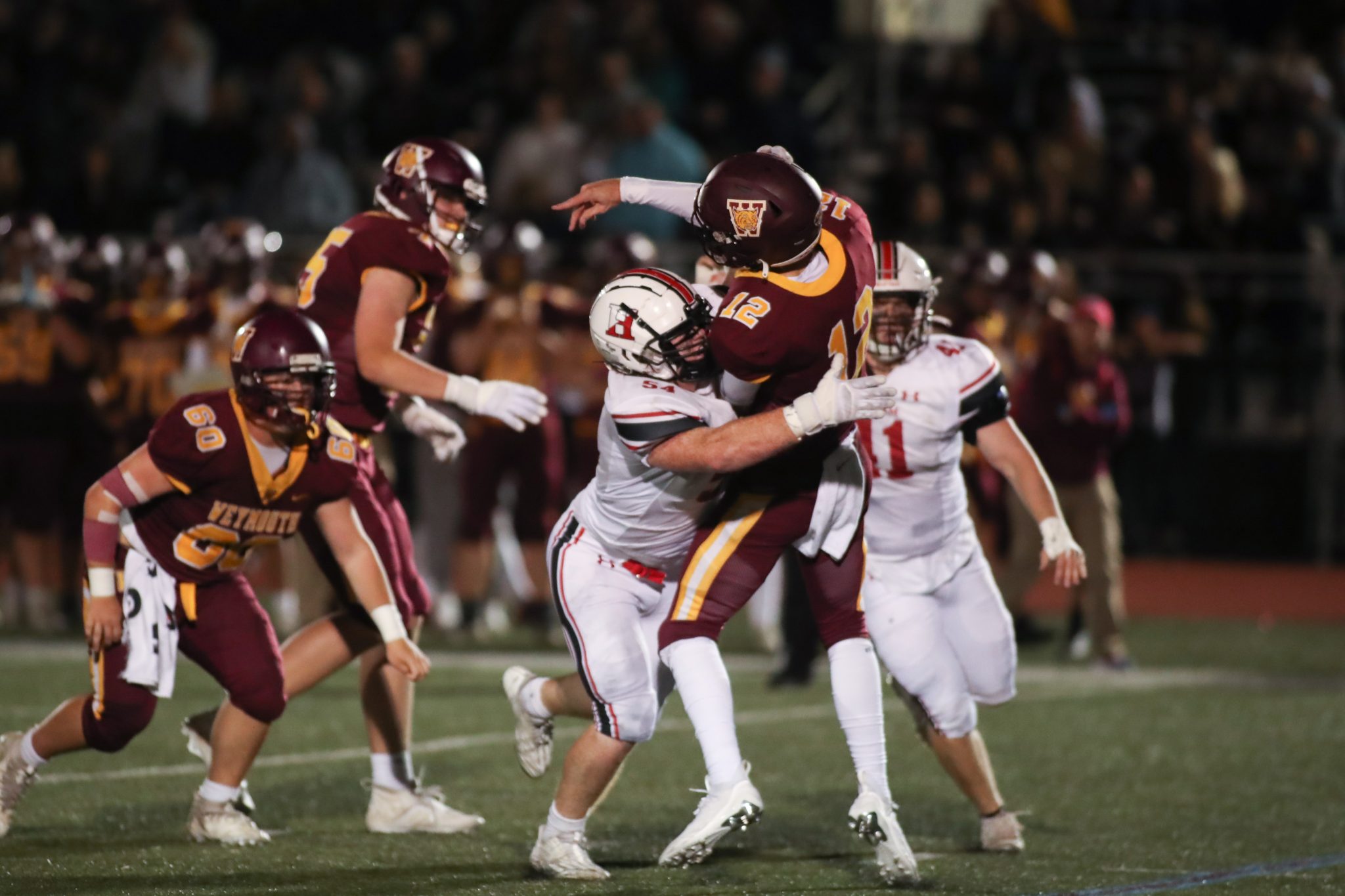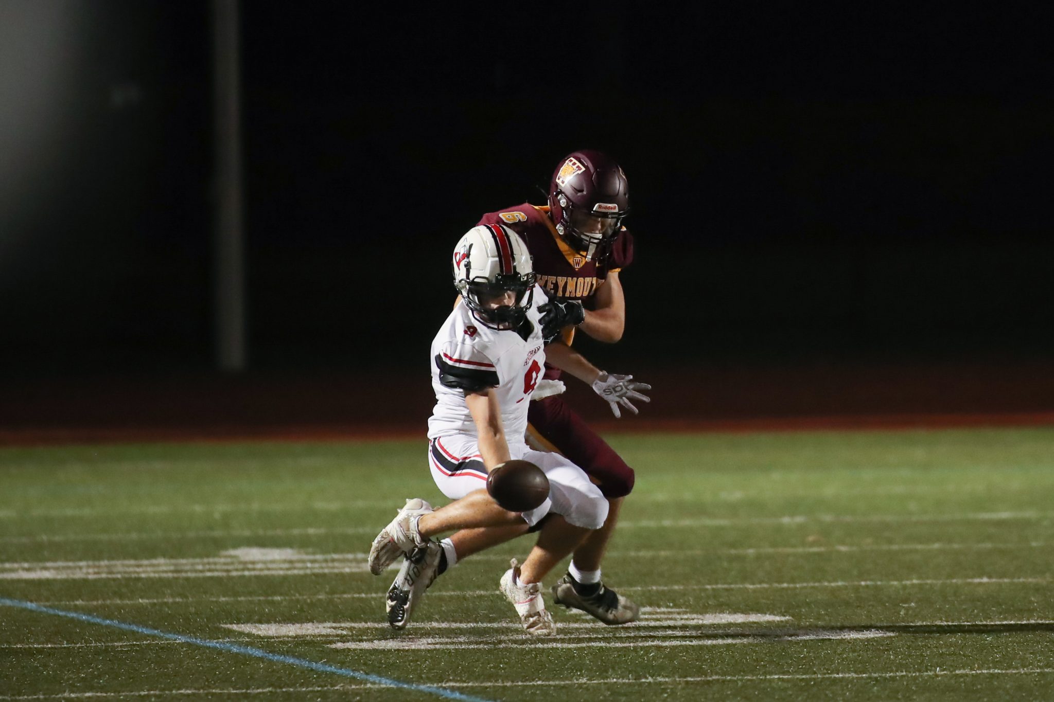 Senior captain Matt Kelley hits the Weymouth QB as he releases the ball late in the 4th quarter in Hingham’s 33-21 loss on Friday night.