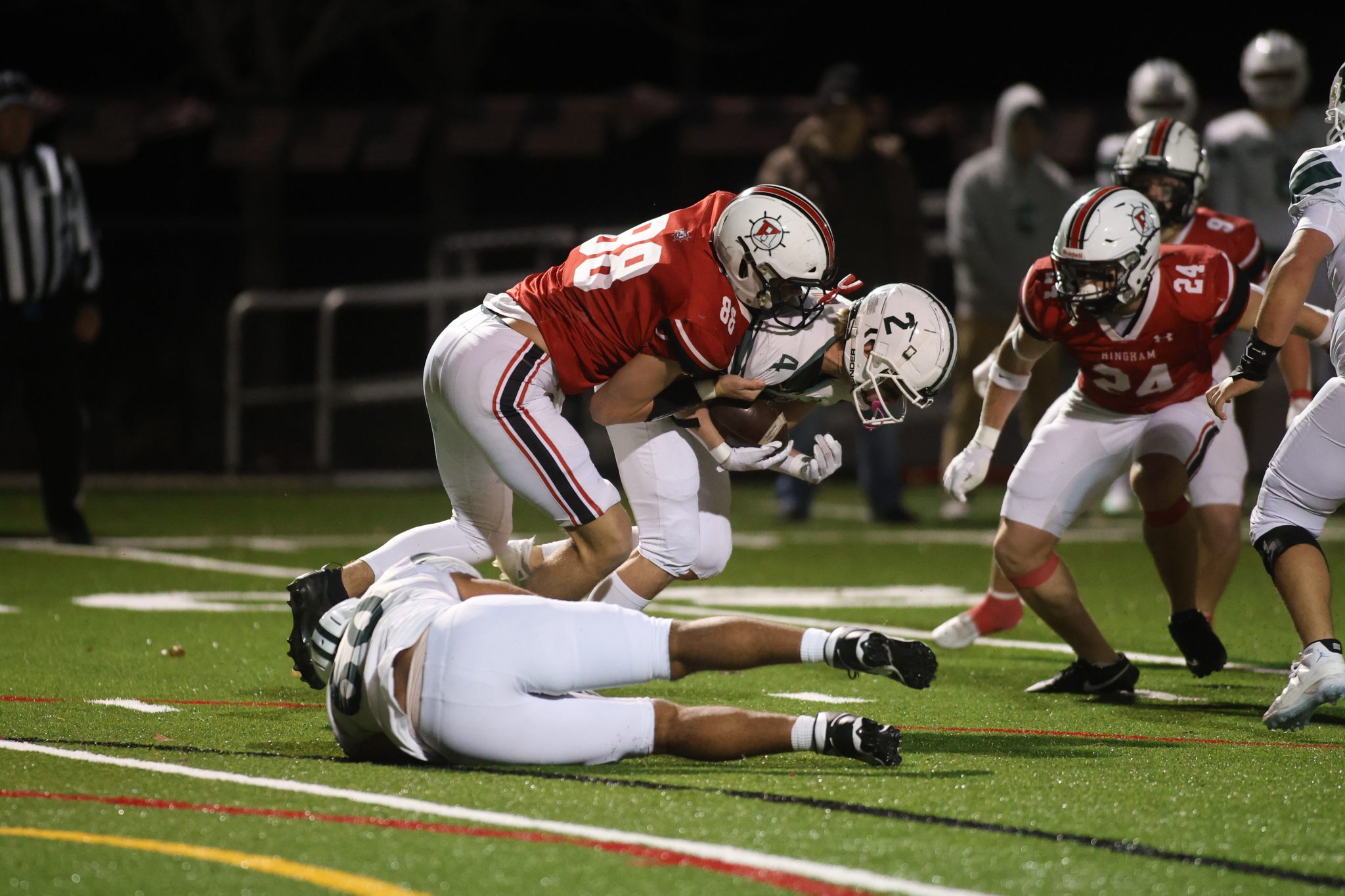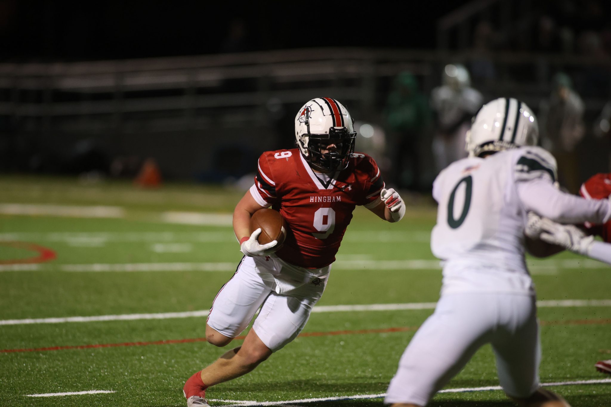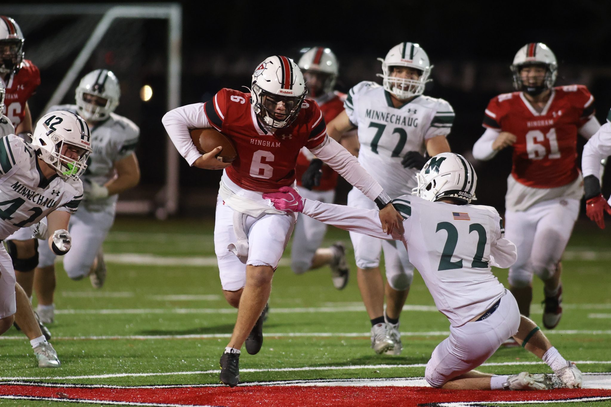Hingham Harbormen took the opening drive the length of the field and never looked back. They scored on their first three possessions and headed into the second quarter with a 22-0 lead over Minnechaug in last night’s Round of 16 Division 3 playoff game. It was a full team effort in the 36-14 win.