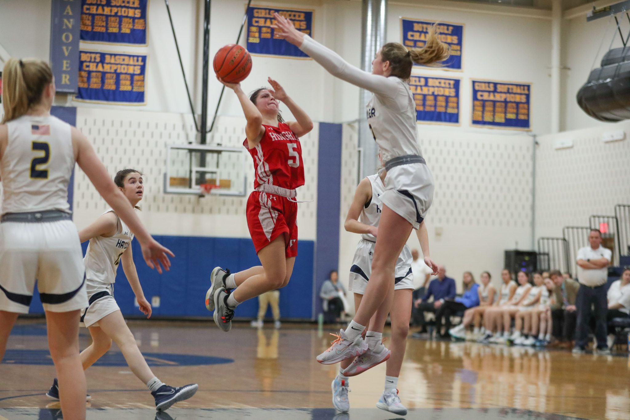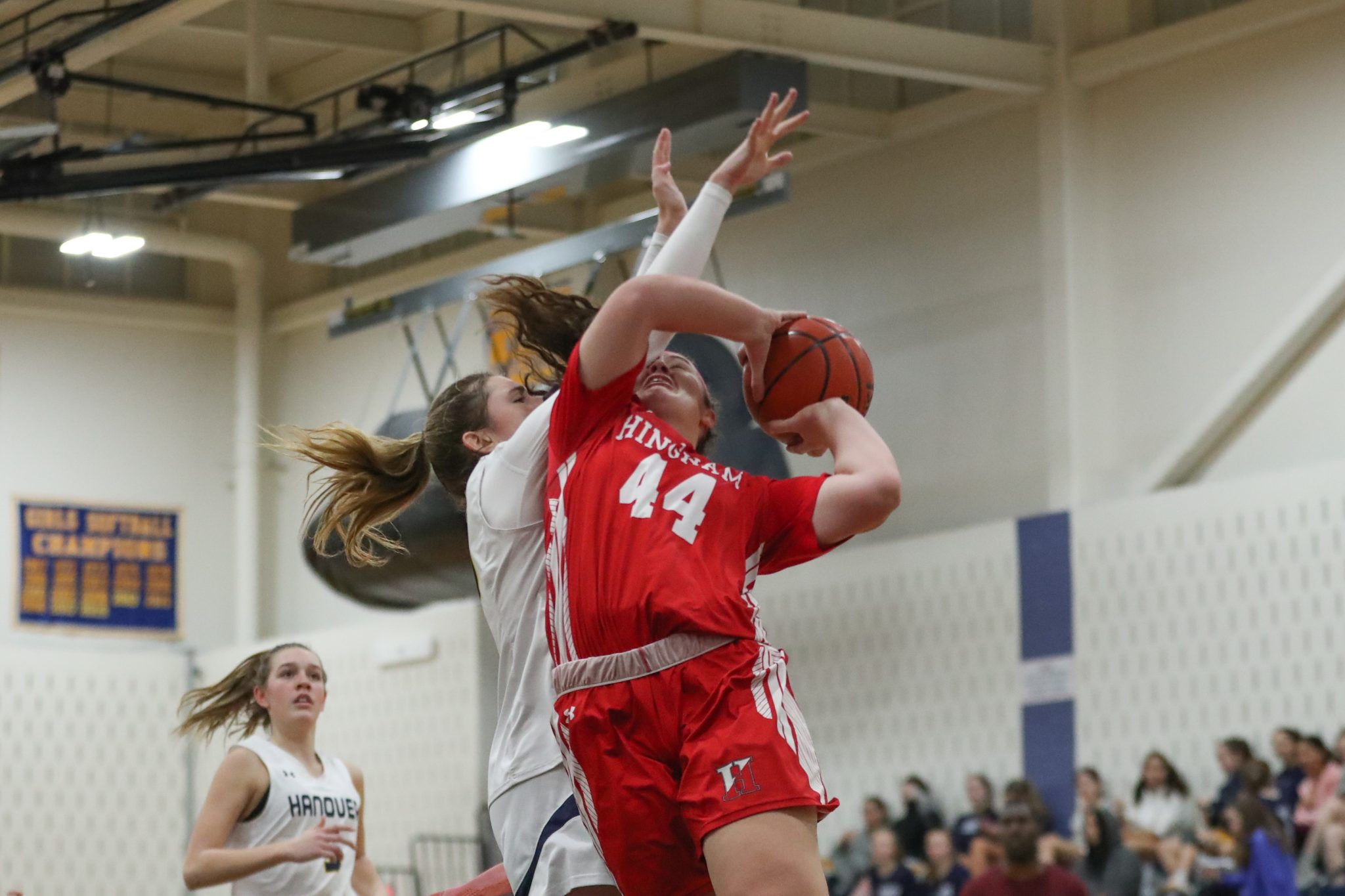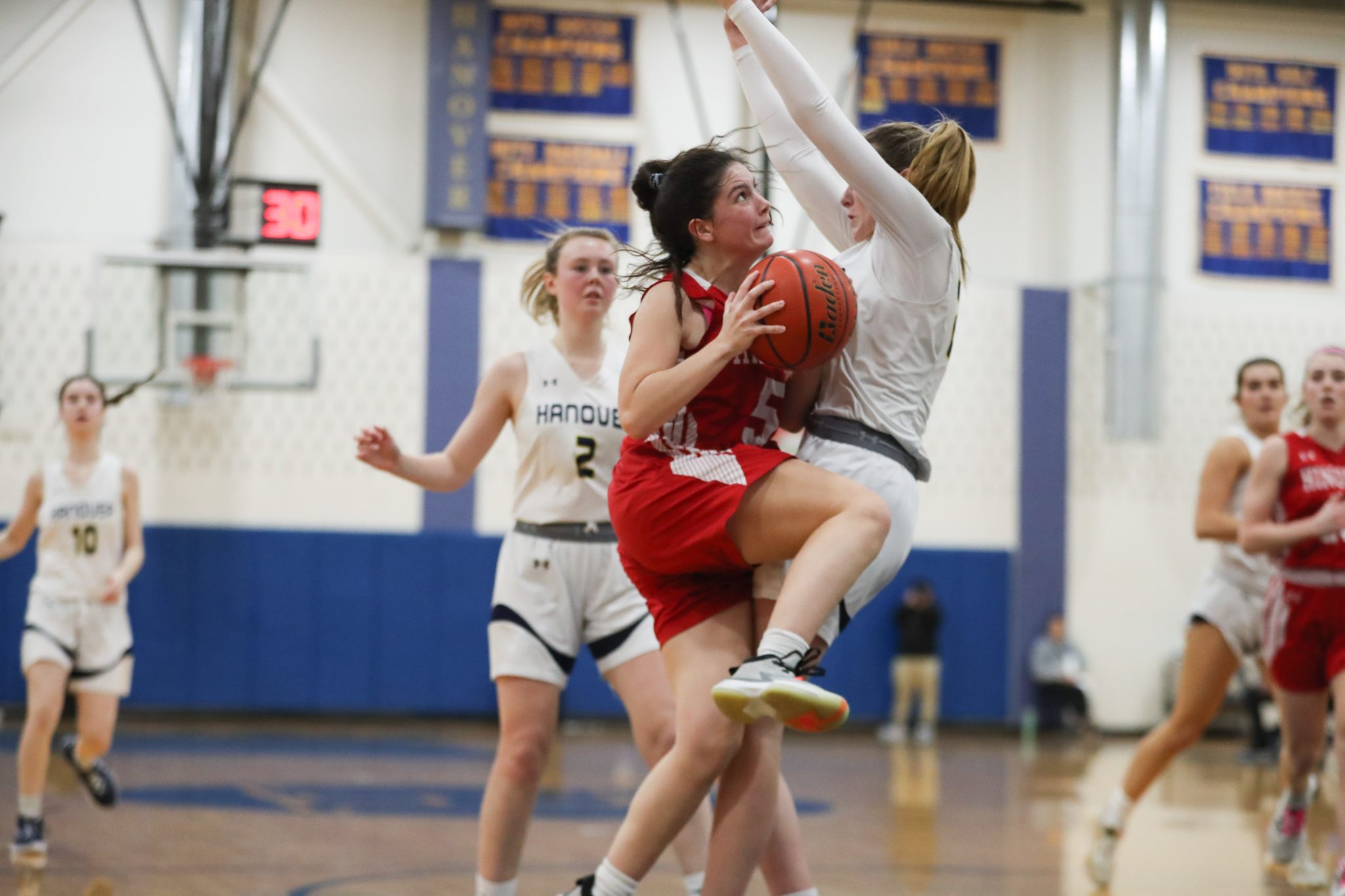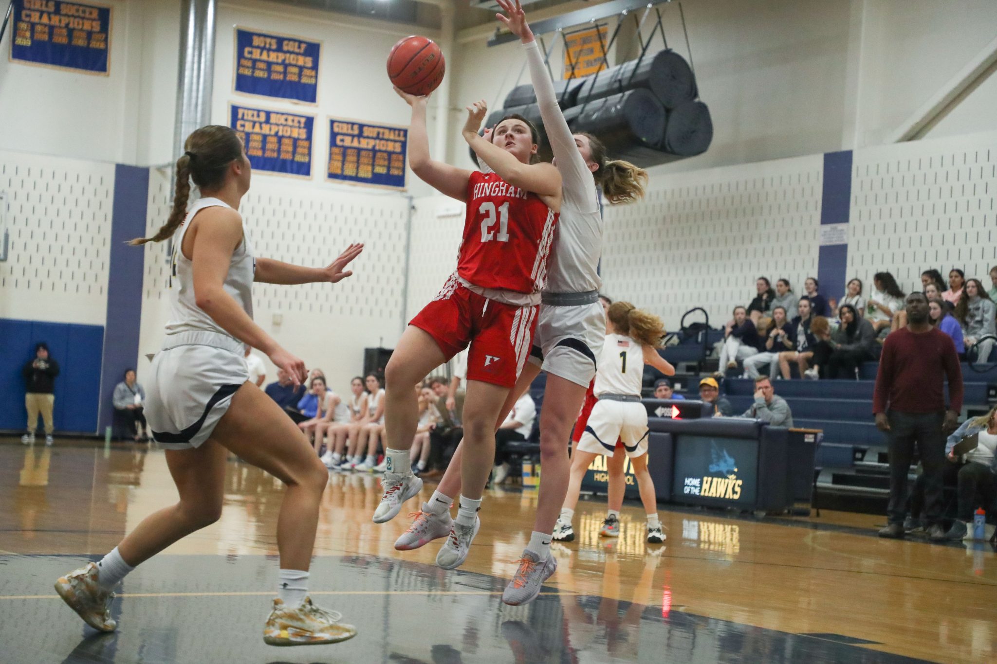 Senior Anabelle Platt drives to the basket late in the 4th quarter in Hingham’s 52-46 loss to Hanover.