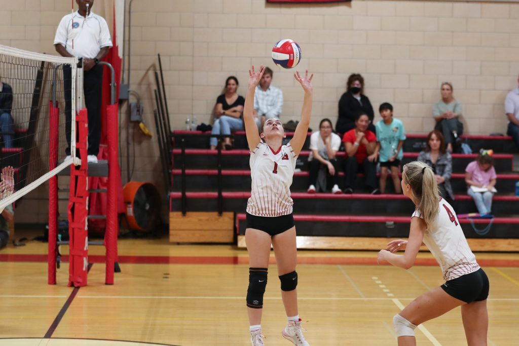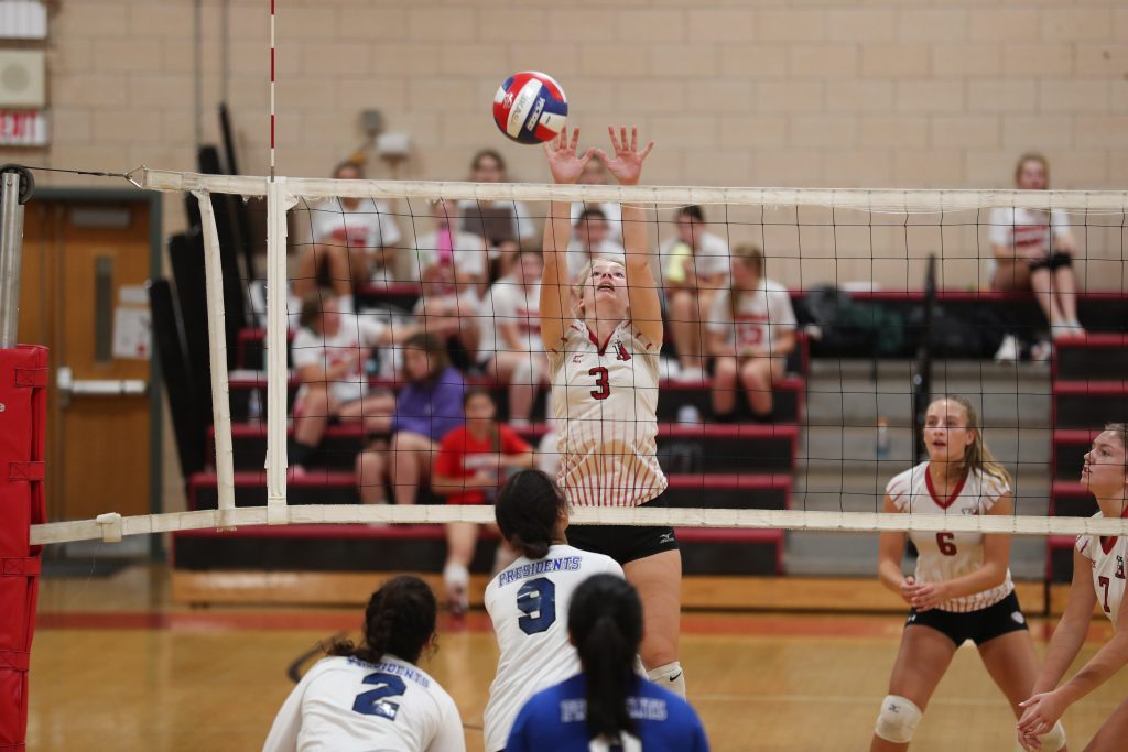 Junior Nora Schulze spikes the ball between two blockers in the first set.