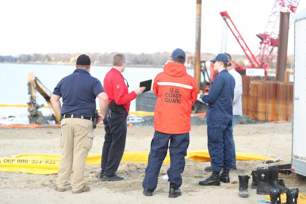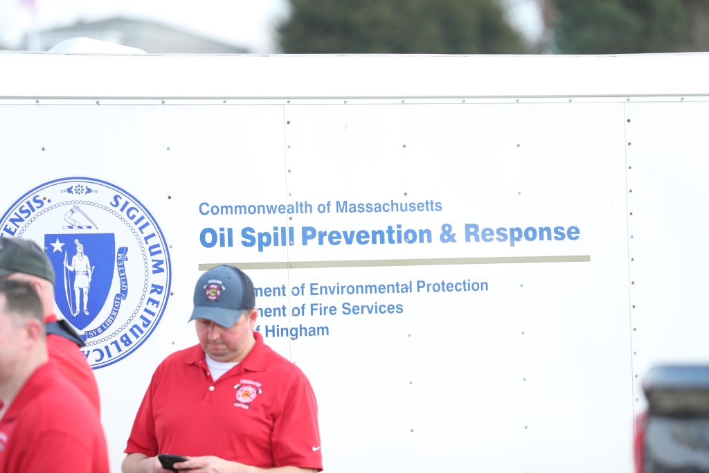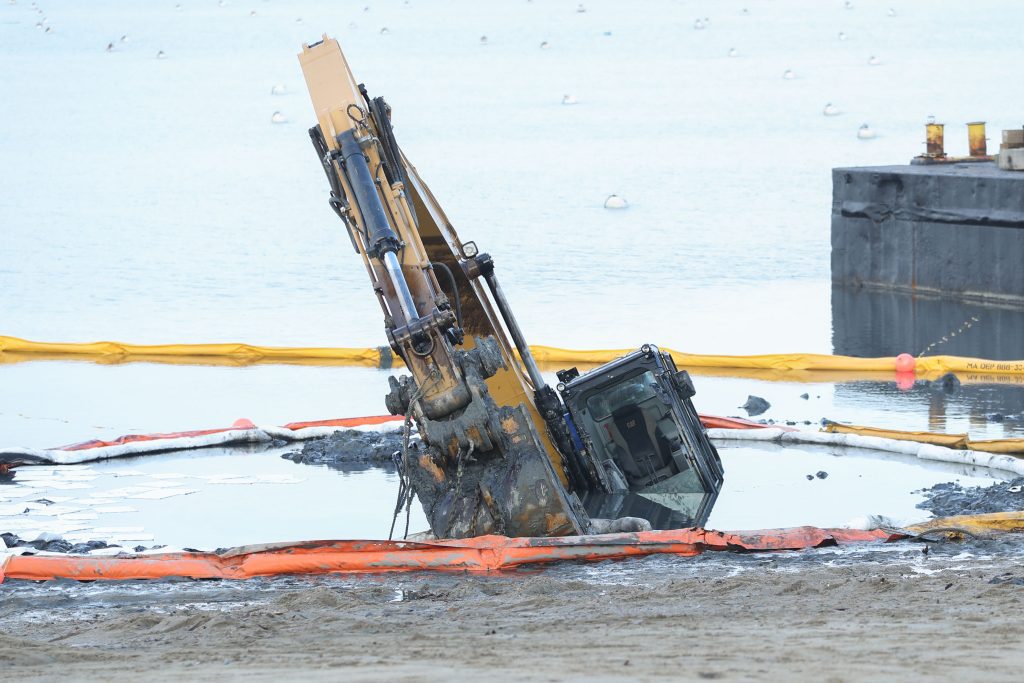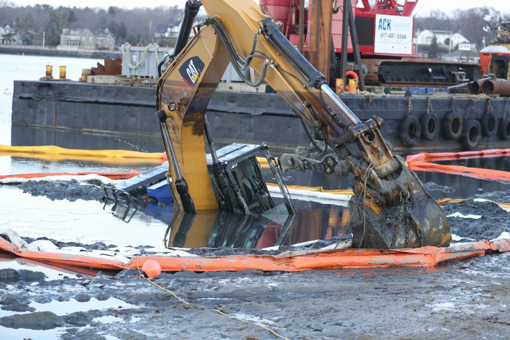 An excavator working on the new boat ramp at Hingham Harbor got stuck, then submerged yesterday afternoon as the tide began to come in. The Coast Guard, EPA, Harbormaster, and HPD were all on scene today to try and remove the large piece of machinery. Oil and gas has spilled into the harbor resulting from the submerged equipment. Removing it was unsuccessful today and they will try again at low tide tomorrow morning.