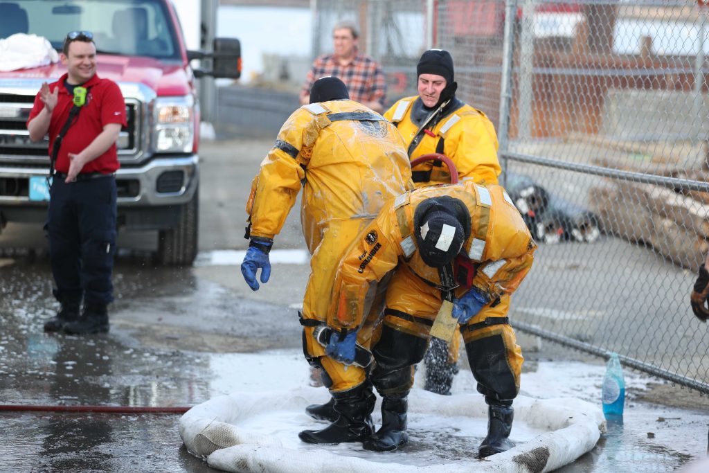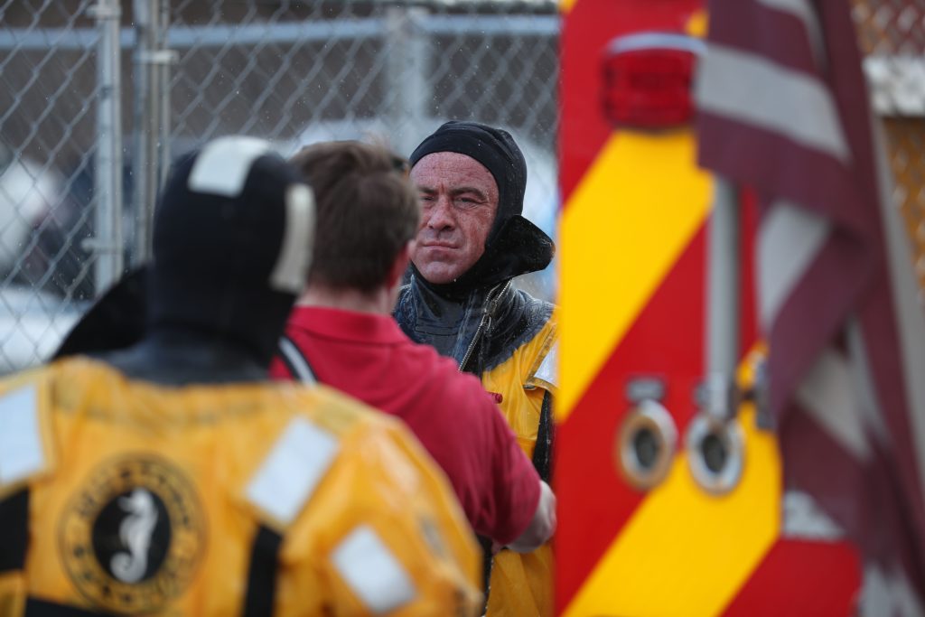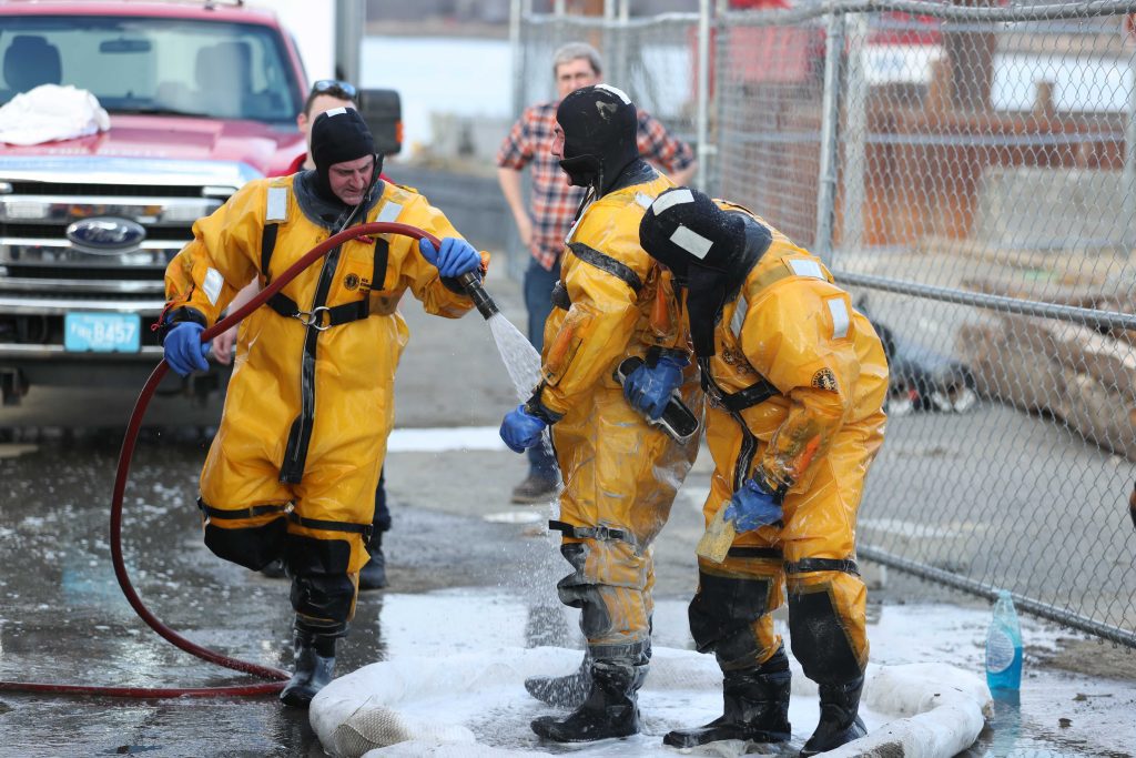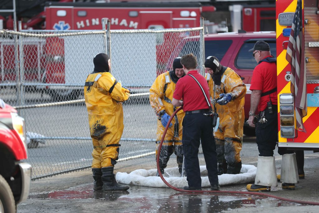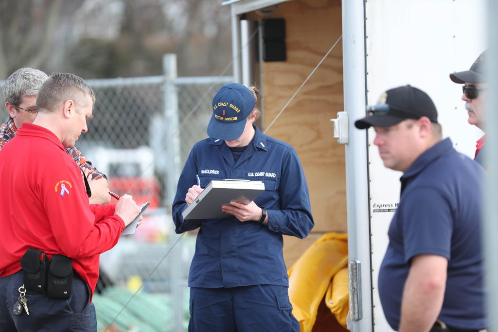 An excavator working on the new boat ramp at Hingham Harbor got stuck, then submerged yesterday afternoon as the tide began to come in. The Coast Guard, EPA, Harbormaster, and HPD were all on scene today to try and remove the large piece of machinery. Oil and gas has spilled into the harbor resulting from the submerged equipment. Removing it was unsuccessful today and they will try again at low tide tomorrow morning.