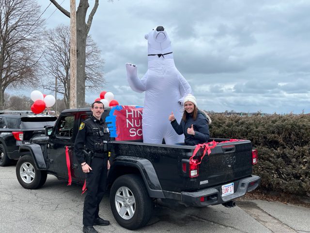 Polar Bear Pete’s entrance has evolved from the first year – moving from a dancing entrance in 2021, a fire truck ride in 2022, to this year’s HNS decorated jeep truck escorted by the Hingham Police Department. While the kids were thrilled to see Polar Bear Pete back in action, they were also excited to see and check out the Hingham Police Department Cruiser. “I loved that funny bear jumping in the water,” 3-year-old Hoyt Murphy excitedly expressed after the event.