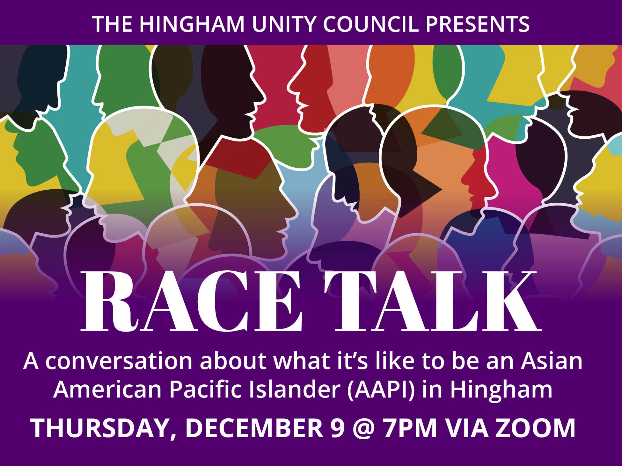 Within the larger context of our nation’s reckoning with race, here’s an opportunity to talk about what’s happening closer to home. Join the Hingham Unity Council (HUC) for a “Race Talk” Thursday, December 9 from 7:00 to 8:15 p.m. on Zoom to uncover some vulnerable and honest truths from our neighbors about what it’s like to be an AAPI person in Hingham for the purpose of understanding and growth as a community.