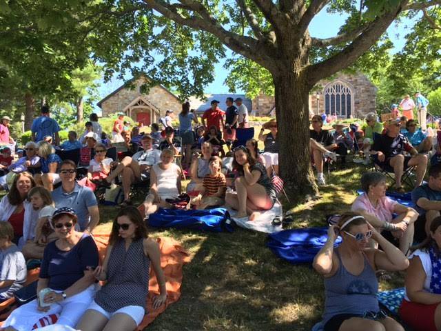 Eventually I stopped sweating — at least after the early service — and enjoyed watching parishioners showing up for the 10:00 am service setting up lawn chairs on the gentle slope of the church lawn, before greeting them as they wandered through the front doors decked out in assorted shades of red, white, and blue. After the service, people hung around chatting, filled with anticipation, and waited for the parade to start.
