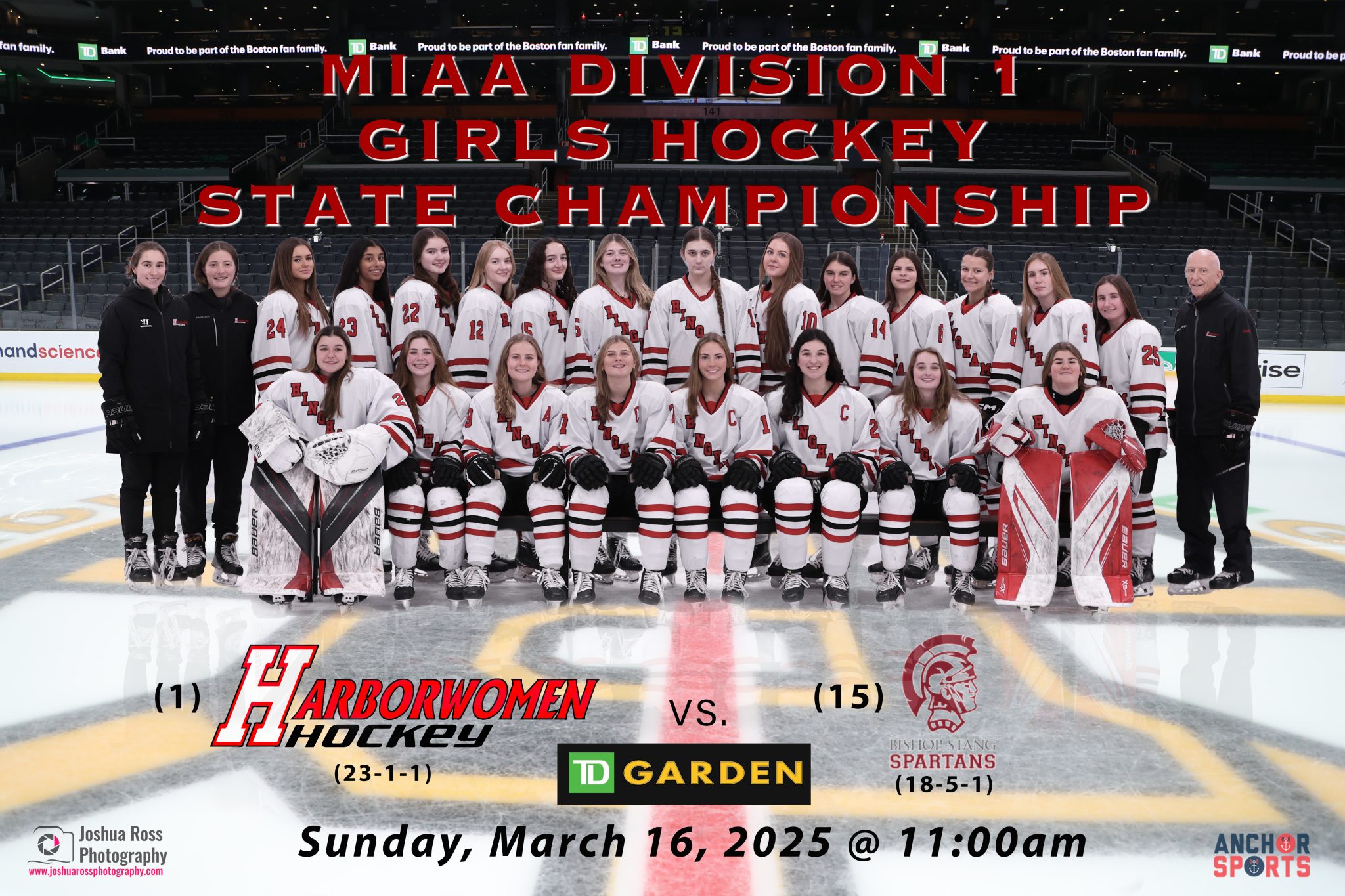 As you may have heard by now, the Hingham Harborwomen will be playing for a State Championship at the TD Garden vs Bishop Stang on Sunday, March 16th at 11:ooam.