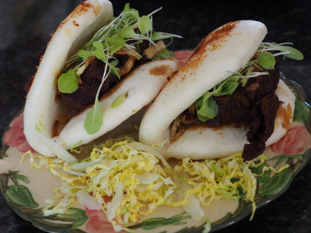 Nomai Pork Belly Bao – red-braised pork belly, miso maggie potato, micro lettuce. A tender, rich, and fragrant pork belly is served with miso umami potatoes and pocketed in a plump, light-as-air bao bun and served with micro lettuce shavings. A rich treat.
