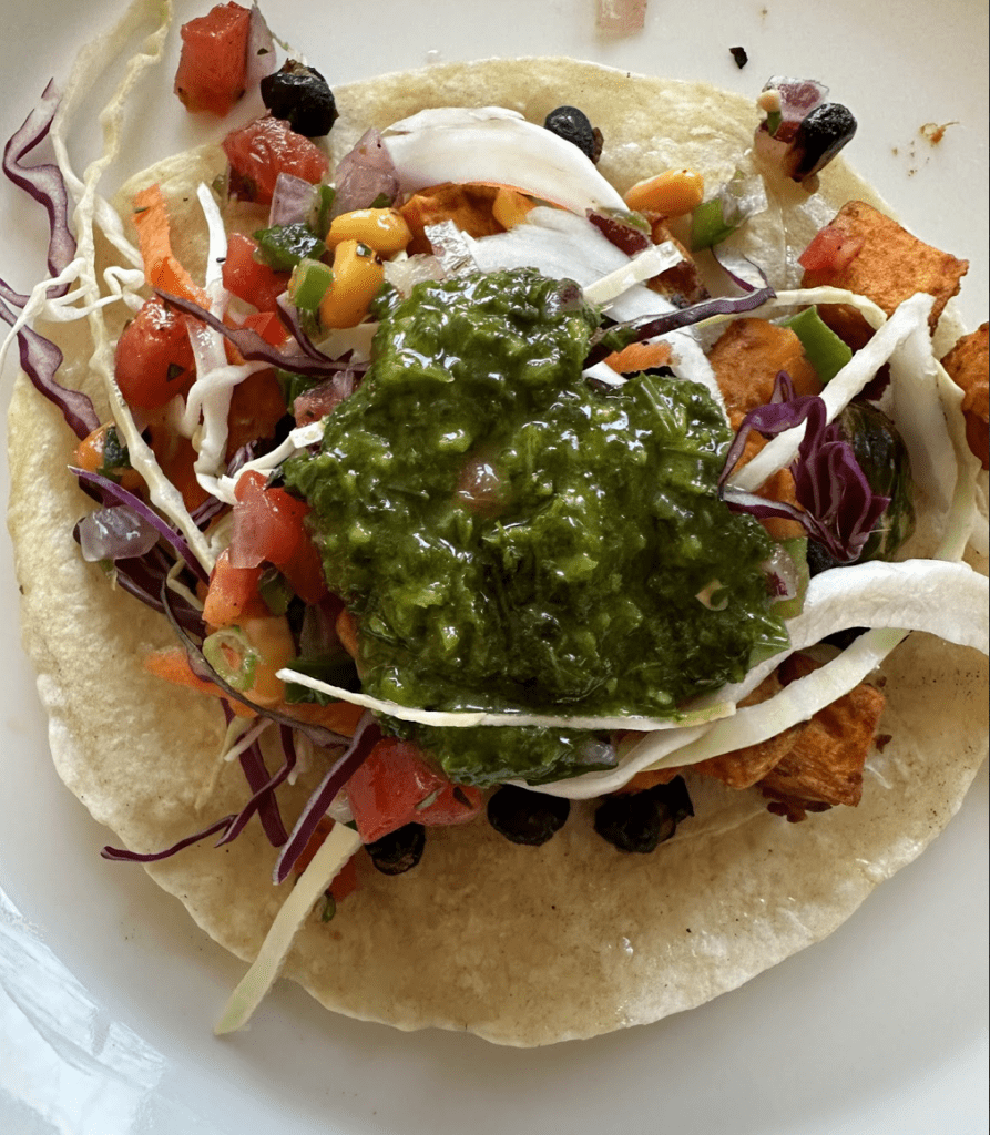 CK Sweet Potato + Black Bean Tacos ($17) – I loved the setup of the sweet potatoes, black beans, and Brussels sprouts with the rainbow slaw, piquant chimichurri, and a homemade pico salsa with corn. It was a happy cacophony of flavors, textures, and colors, and full of nutrient-rich foods.