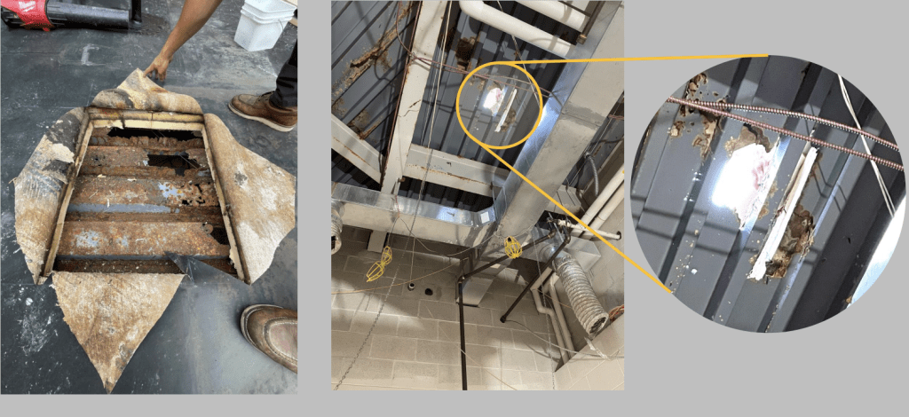 While replacing an HVAC unit over the summer – a project that had been previously scheduled – significant roof corrosion was discovered, requiring immediate reinforcement.
