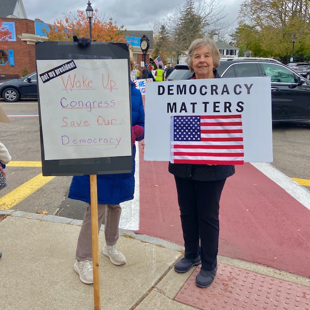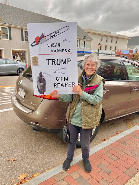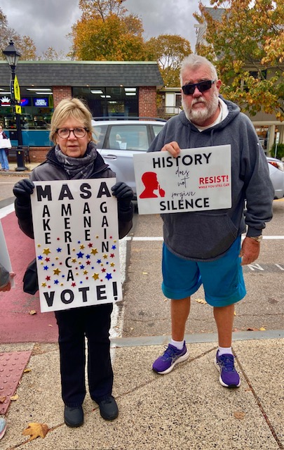 For 39 consecutive weeks, the group has held a weekly standout in front of the post office and St. Paul Church in downtown Hingham on Wednesday mornings, rain or shine – holding colorful and creative signs protesting the policies of the Trump administration – and they have no intention of stopping.