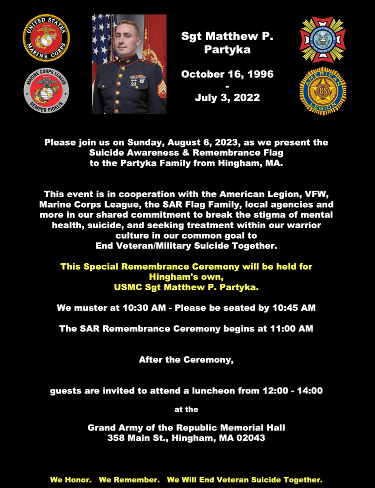 This Special Remembrance Ceremony will be held for Hingham’s own, USMC St Matthew P. Partyka. (Muster at 10:30 a.m. — attendees are asked to be seated by 10:45 a.m.)