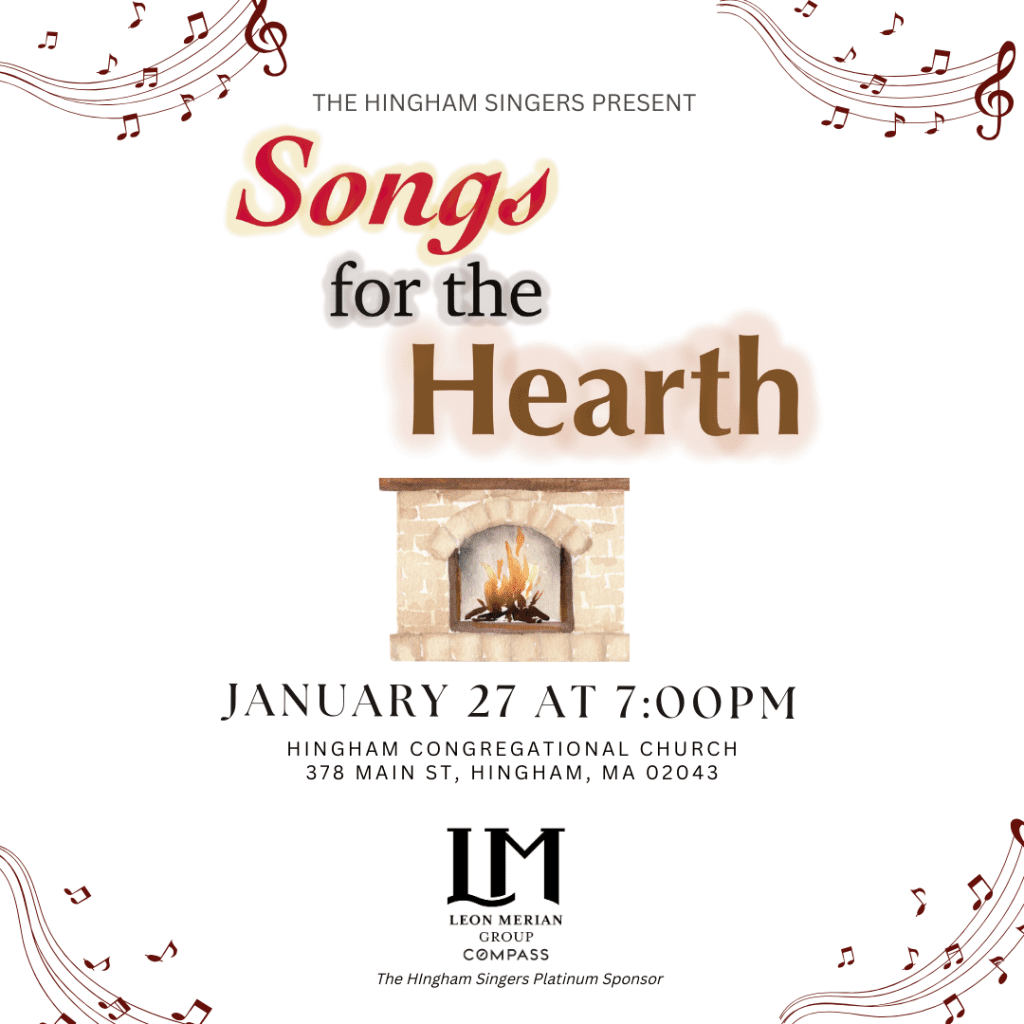 Please join the Hingham Singers at their winter concert “Songs from the Hearth” on Saturday, January 27 at 7:00pm at Hingham’s Congregational Church. Tickets are $20 and can be purchased online or at the door.