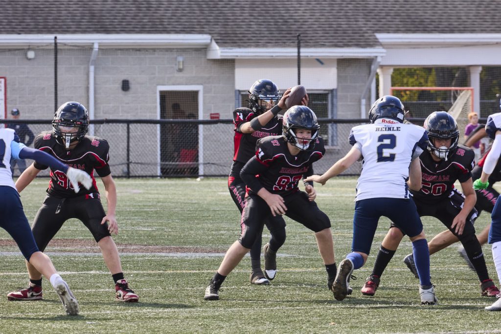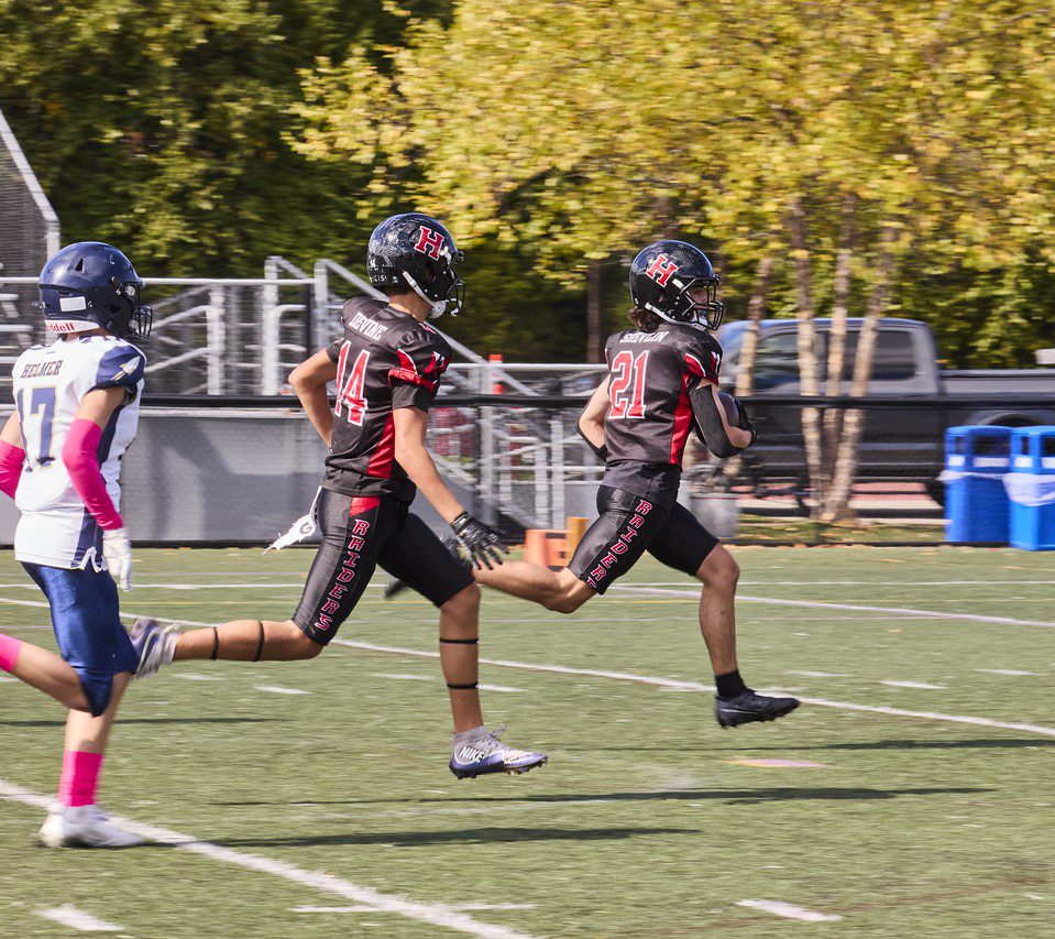 In the second half the defensive controlled the line of scrimmage with Mason Devine, Esra Everley, Will Taylor, Ryan Crespi and Asher Ellis shutting down the run and Ryan Fernquist intercepting a pass at the 31 yard line for a turnover. A quick pass from QB Deininger to Carter Karis and a run by Coen Melgoza had the Raiders on the move but Needham forced a seldom turnover on downs. The defense dug in with Ryan Crespi and Jordan Owens-Ayala sacking the QB and Coen Melgoza and Wes Govini causing a fumble which Mickey Syp recovered deep in Needham territory. One play later the speedy Johnny Heller weaved his way through the defense to hit paydirt and a 38-0 lead. After intense pressure from Duncan Wilder and pass break ups by Grant Riordan and John Peterson, Needham managed to score a TD on the drive. Will Berkeley blocked the point after. First down runs by Cam Forger and Jack Hart enabled QB Garrity to roll to his right and hit Evan Tomasello for a 27 yard TD. Closing out the game, Matthew Palermo made a leaping catch to intercept a pass that secured the 44-6 victory to remain unbeaten.