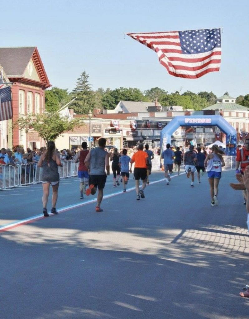 The event, organized by the Hingham Recreation Commission, is a 4.47 mile run/walk following historic Main Street through town, with an exceptional spectator-lined finish, under the giant flag hanging across the square at Hingham Institution for Savings.