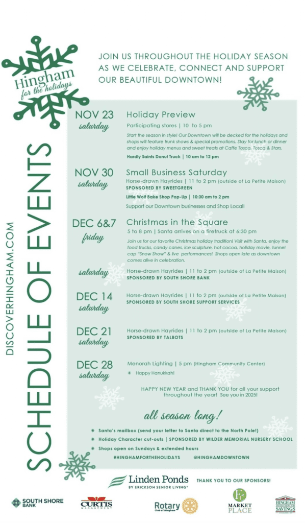 The Hingham Downtown Association deserves a holiday shout out,” Levin said. “From the festive lampposts [campaign] to the much-anticipated Christmas in the Square event, the HDA works tirelessly to ensure that the shops and other businesses are working together to make downtown a shopping destination. ”