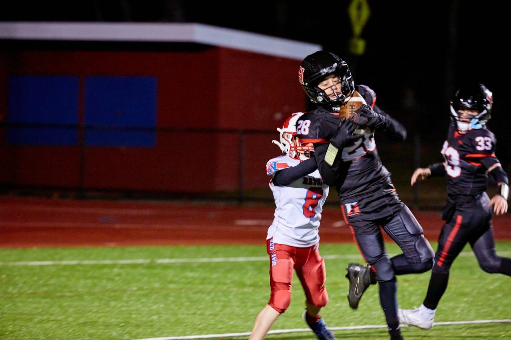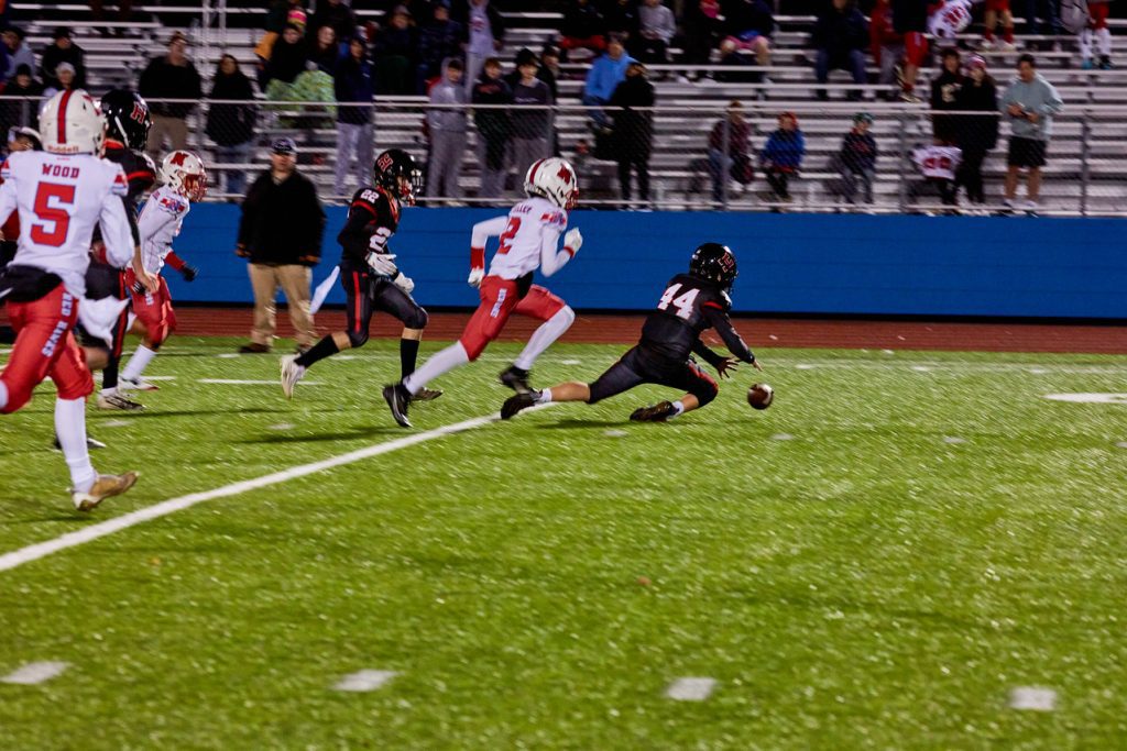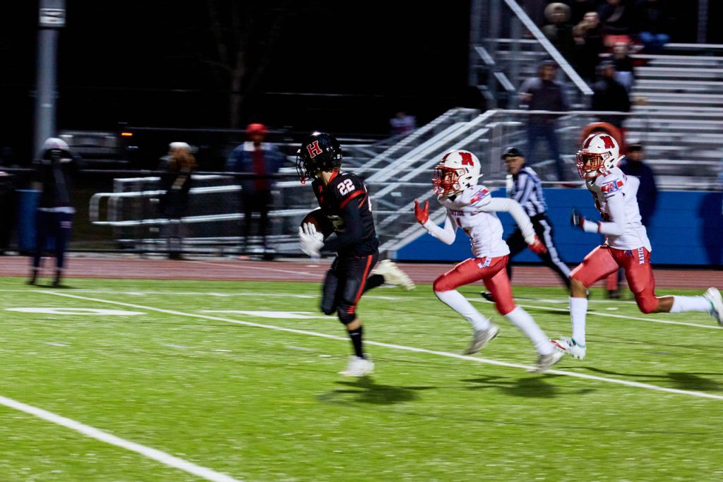 In the second half Hingham came out aggressive on offense with Frank Cavagnaro, Teddy Lovendale and Braden Huber creating a big hole for (RB) Evan Tomasello to scamper in for a 23 yard touchdown to take the lead at 12-6. Having a resilient defense comes through at times like this late in the season as Denny Costello continuously forced the QB out of the pocket while Andy Gerlach and Mason Aframe made tackles for losses. Evan Tomasello broke up a critical pass to force a Natick punt that ultimately pinned Hingham at their own one-yard line. With its back to the goal line (QB) Garrity ran outside blocks from Wilder and Will Taylor for a first down. Now in the 4th quarter Hingham controlled the ball on the ground with an eight play drive where Hudson Garrity deftly avoided defenders for consecutive first downs and ran for his second touchdown and an imposing 18-6 lead with fewer than seven minutes remaining.