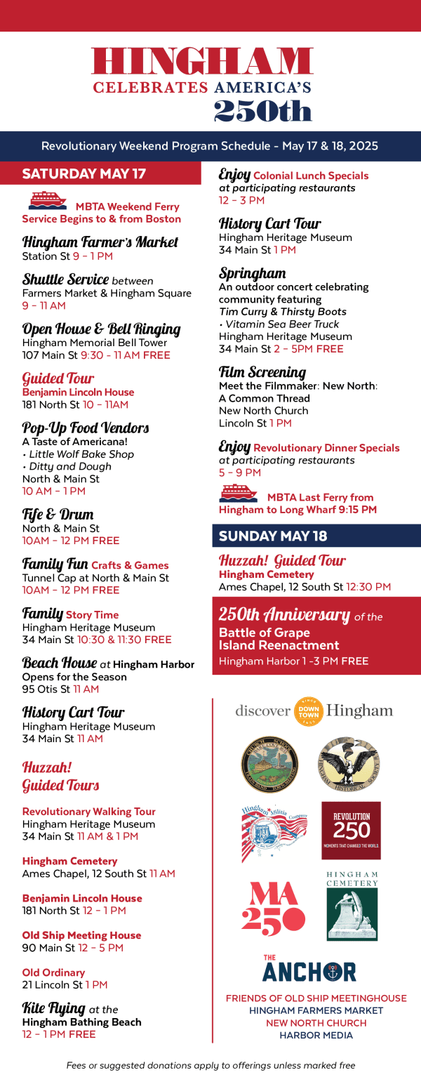 This weekend consider your plans made!! Hingham will kick off its own REVOLUTION 250 celebrations with Revolutionary Weekend May 17-18, 2025, celebrating ordinary people who did extraordinary things and unwittingly became authors of American History.