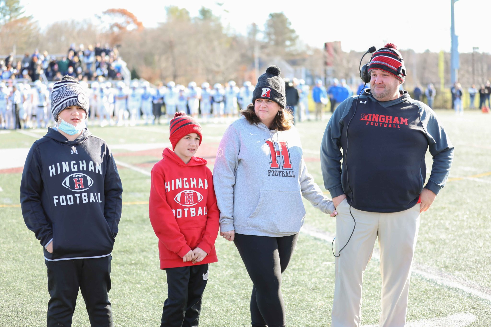 The whole Nutley family was honored two years ago during a Hingham football game when the team and community raised money for Becky’s Brigade. Last year, Becky didn’t make it to the game, but Mark and their two sons Adam and Sean were there representing her. Mark spent 5 years with Hingham High football, four of them as head coach.