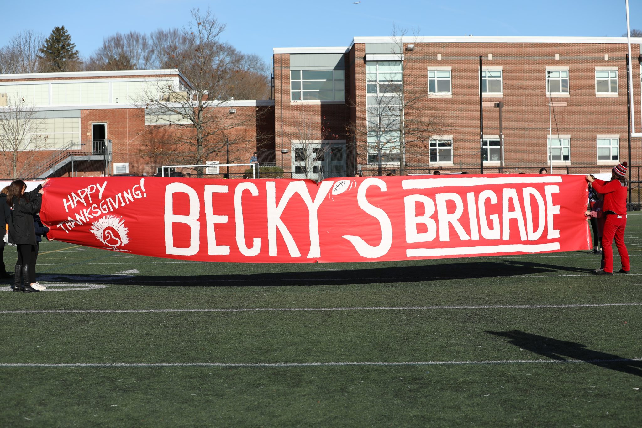 It’s not every day that someone can unite three rival sports communities for a shared cause, but Becky Nutley achieved exactly that. Over the past few years, Becky, the wife of former Hingham High head football coach Mark Nutley, dedicated herself to raising funds and awareness for Multiple Myeloma through Becky’s Brigade. Her efforts extended to their hometown of Marshfield, the neighboring town of Hingham, and Quincy, where both Becky and Mark worked in the public school system.