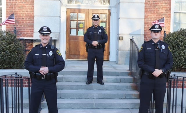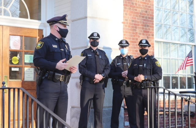 Prior to the official swearing in ceremony, Police Chief David Jones welcomed their families and congratulated the three new officers. The small outdoor ceremony was held in front of Town Hall, with the oath of office administered by Town Clerk Eileen McCracken. Each officer signed a copy of their oath and had their badge pinned on their uniform by a family member or friend.