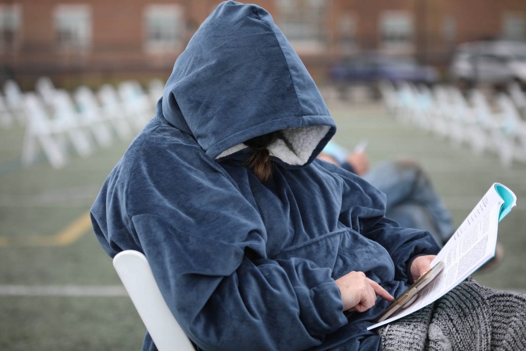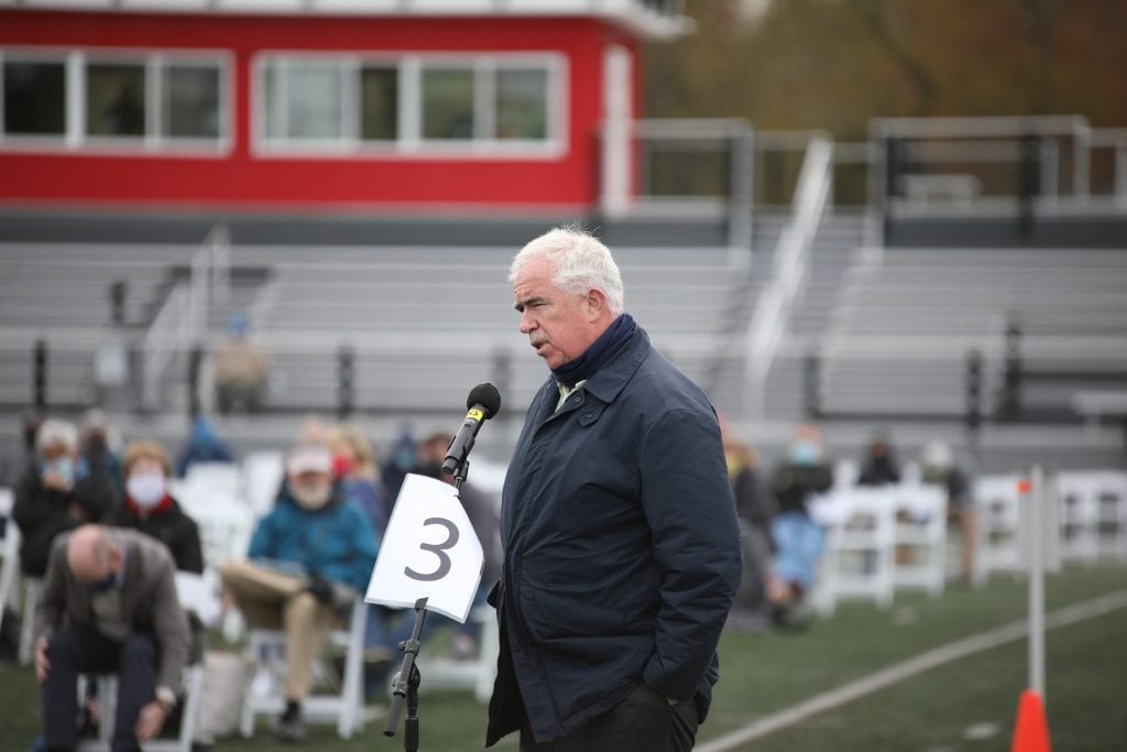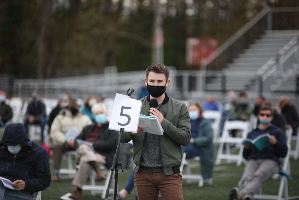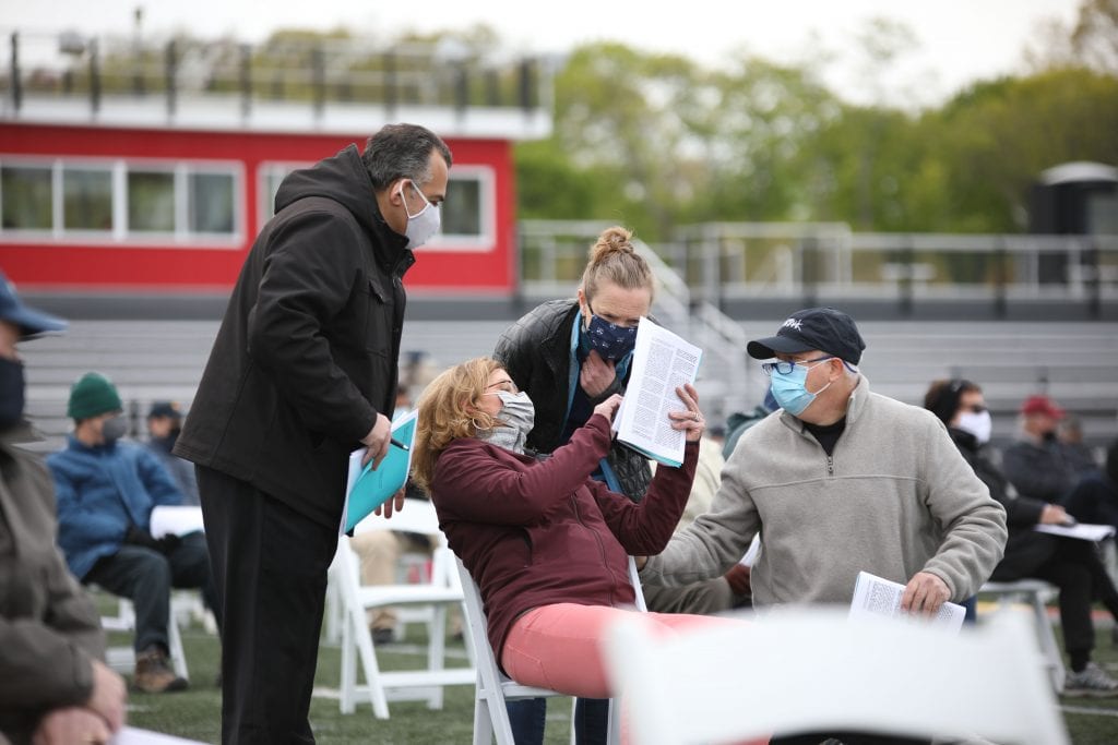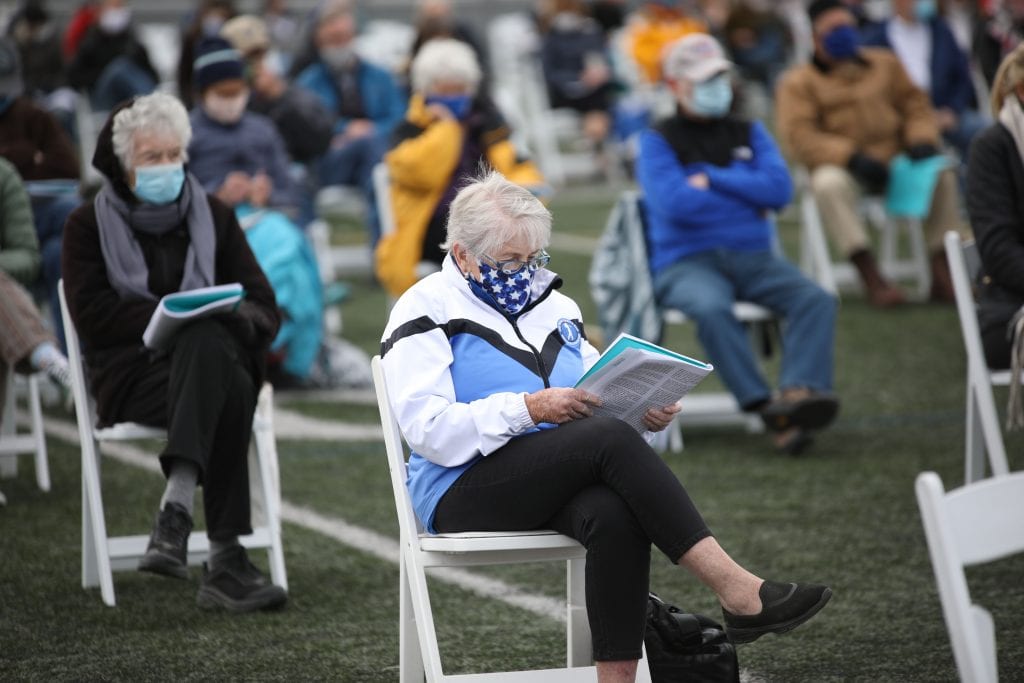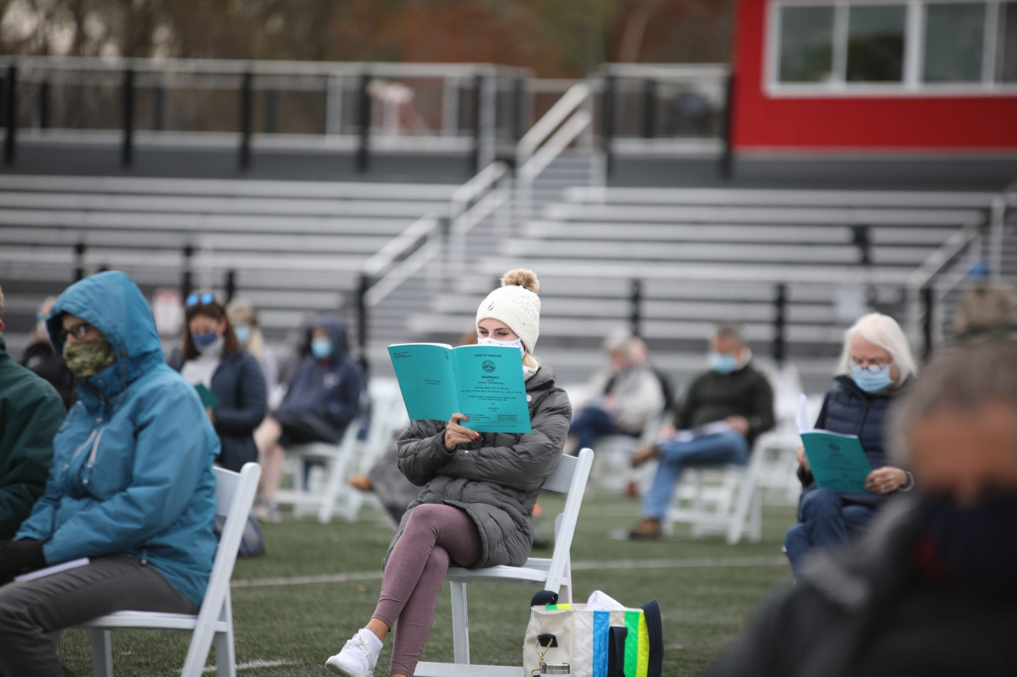 For Saturday's Town Meeting, the weather held out and a good crowd -- bundled up, wearing face masks and socially -distanced -- gathered on the Hingham High School multi-purpose field to address 28 warrant articles.