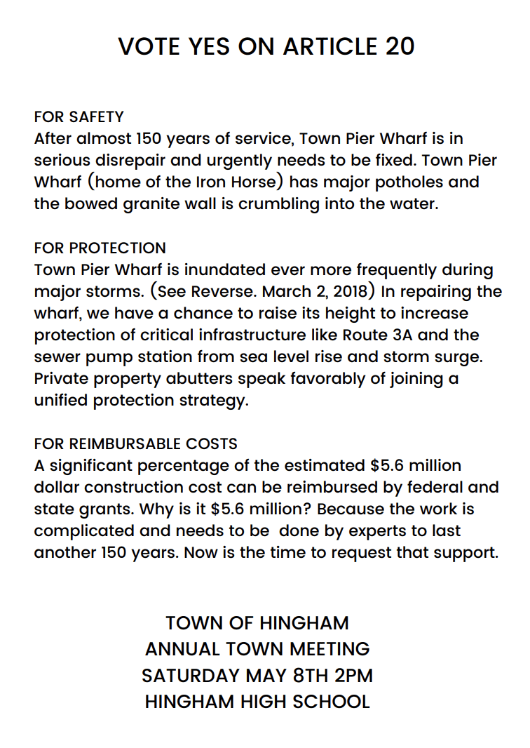 All the members of your Town’s Harbor Development Committee ask for your positive vote on Article 20! Both the Board of Selectmen and the Advisory Committee also unanimously recommended positive action on Article 20 to reconstruct Town Pier Wharf.