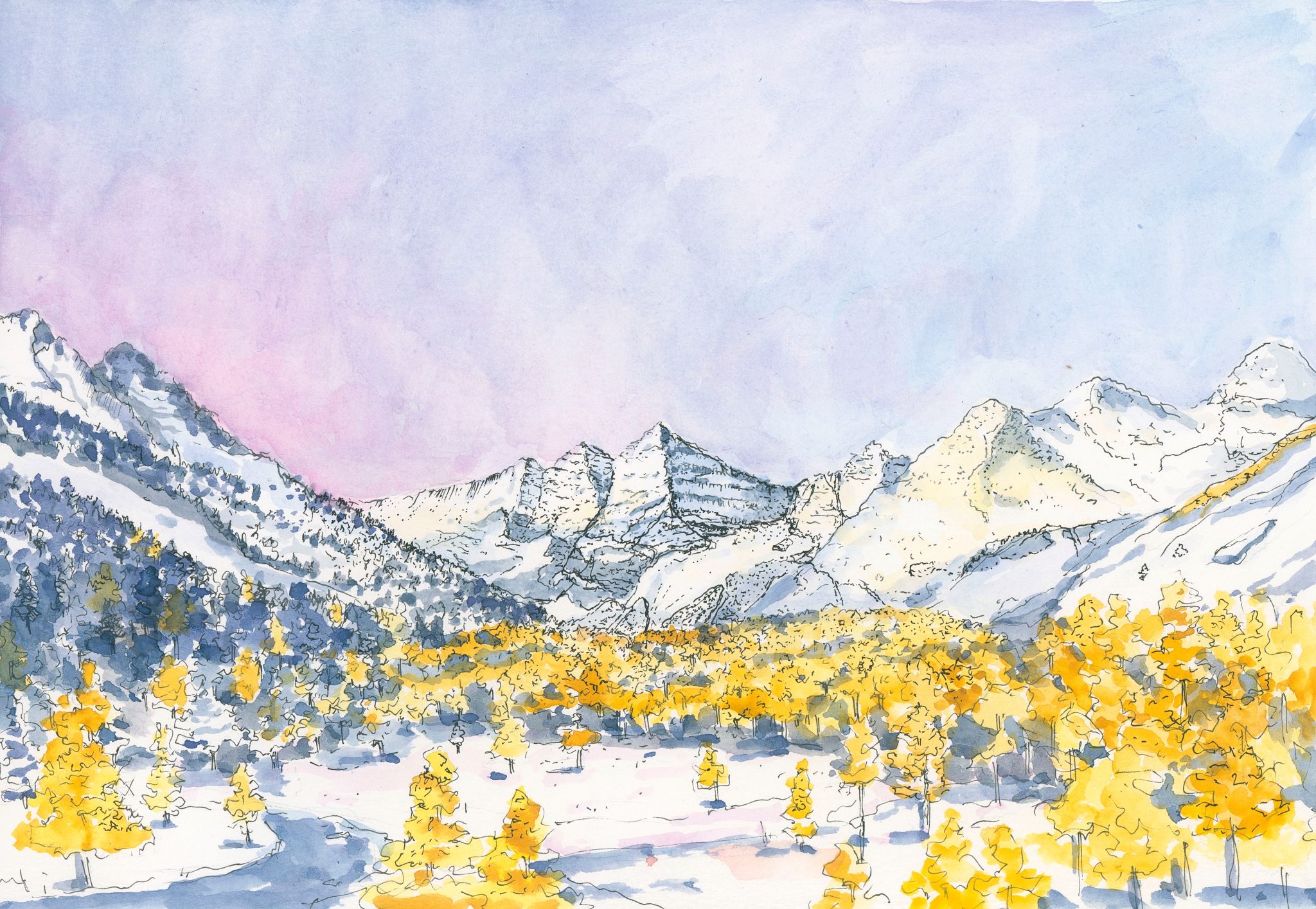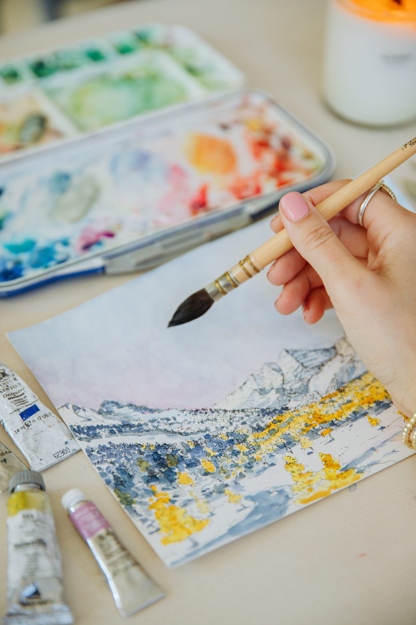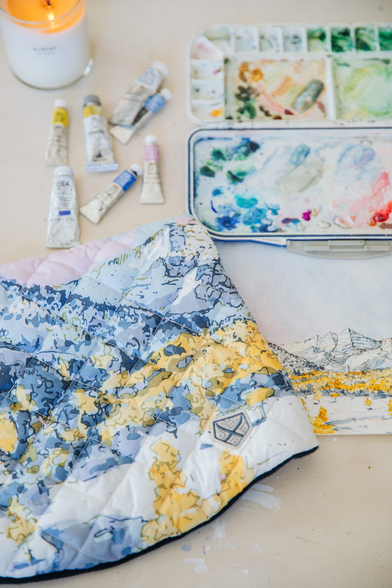 Teaming up with Jillian Moorhead (founder of Powder Puff Collection) on our “Aspen” Powder Puff collaboration was amazing! Our Powder Puff is a combination of Jillian’s love for golden Aspen trees and beautiful snowy mountain tops mixed with my love for detailed design using fine ink and a complimentary palette. Jillian supplied me with photos of Aspen trees that she had taken on hikes with her family which led to my preliminary sketch idea. With our Powder Puff, I created a “back into the wild” design by painting a field of golden Aspen trees and married it with ultramarine French blue hues found in the shadows of the mountains.