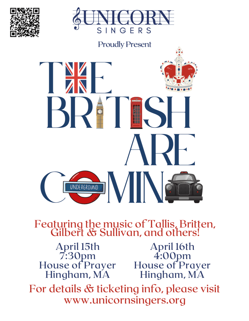 The Unicorn Singers invite you to join us for our spring 2023 concert The British are Coming! Our program pays homage to Queen Elizabeth II who was known, and appreciated, both for her down-to-earth nature and for her sense of humor. Ranging from the sublime to the ridiculous, the concert will feature George Frideric Handel’s Zadok the Priest, written to mark the coronation of King George II in 1727, Thomas Tallis’ O Nata Lux associated with the Feast of the Transfiguration, and Benjamin Britten’s Rejoice in the Lamb, depicting varied and beautiful images of worship. Our show will culminate with selections from Gilbert and Sullivan’s first international hit, H.M.S. Pinafore, poking good-natured fun at the Royal Navy and the English obsession with social status. The Music Director would like to think Queen Elizabeth II would have appreciated our program, filled with poignant beauty… and a couple of jabs. The Unicorn Singers, directed by Randy McGee, are based in Hingham and include singers from Hingham and throughout the South Shore. Hingham members include Tracy Allen, Lynn Anderson, Ed Bartholomew, Betsy Clifford, Sally Davenport, Jo-An Heileman, Jeffrey Mailhot, Patty McDonald, and Kathy and Bill Reardon, and Stewart Wood.