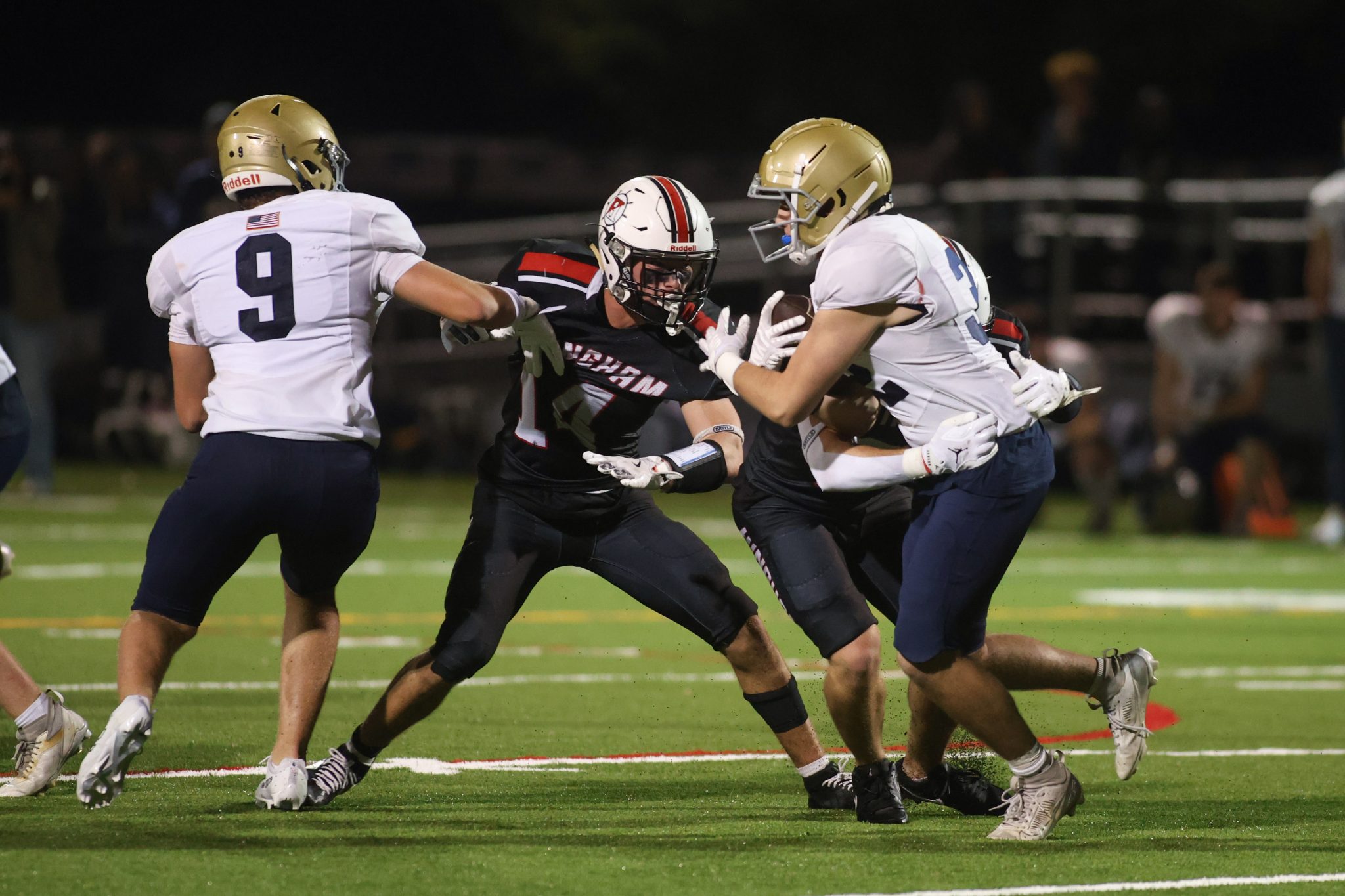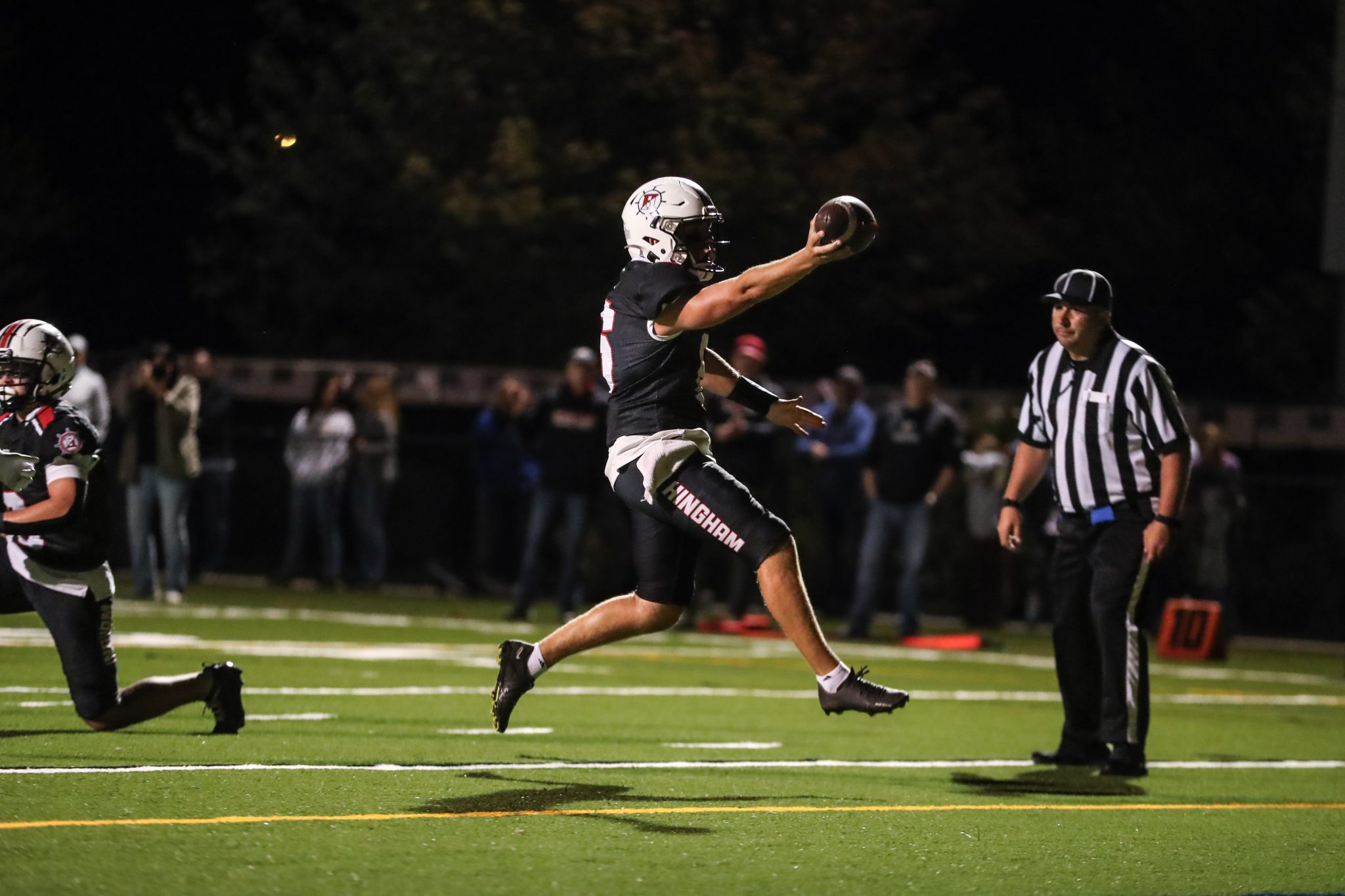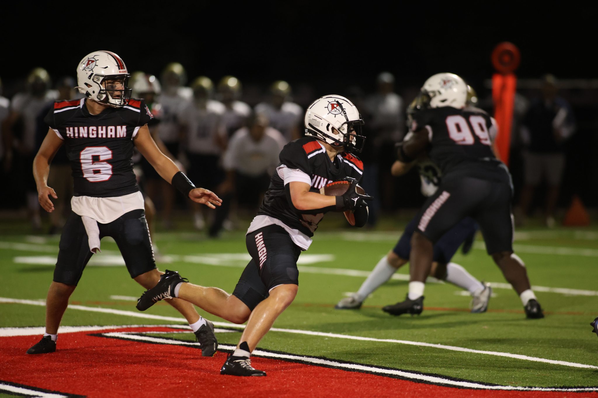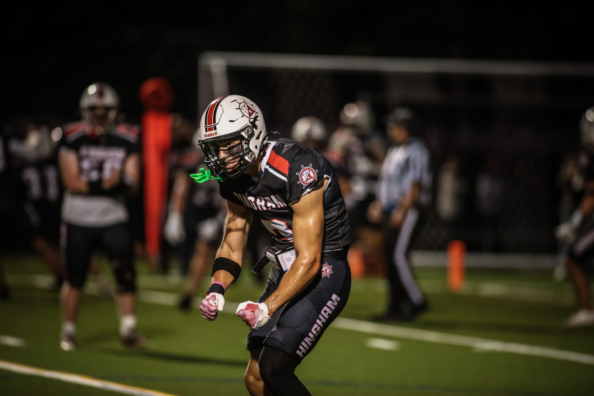 Senior quarterback Jake Varholak settled his team down and ran in the Harbormen’s first TD of the season from 8 yards out in the second quarter sending the game into halftime tied at 7. Picking up where he left off with his legs, Varholak, who had 75 yards on the ground, gave Hingham their first lead of the game with his second rushing TD in the third quarter, 13-7 (missed extra point).