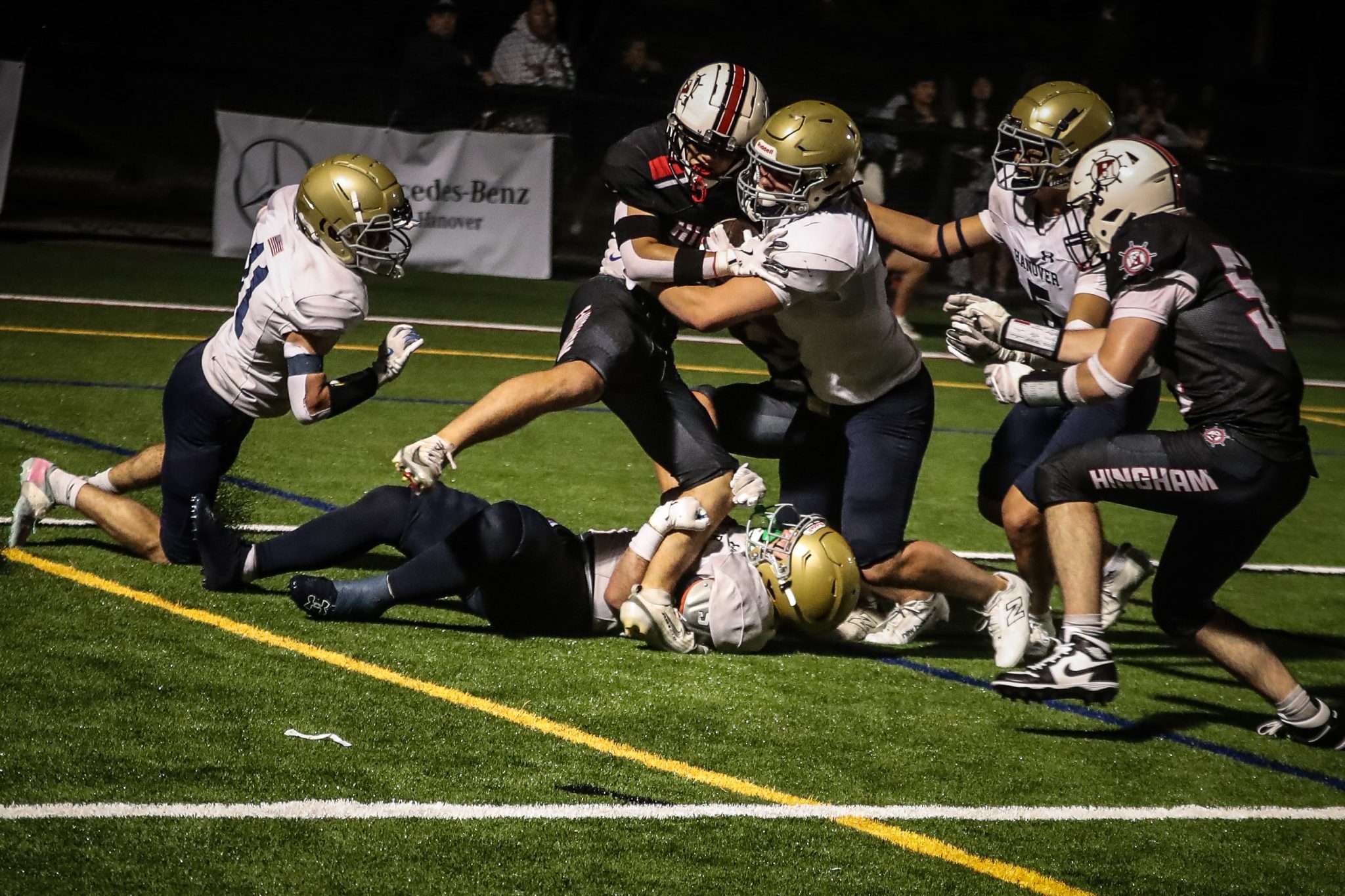 Hanover took most of the first quarter to take the game’s opening kick-off down the field before senior Aedan Milligan intercepted the ball inside the 10 yard line. Junior Riley Bello would more than make up for fumbling Hingham’s first possession of the game, leading to a Hanover score.