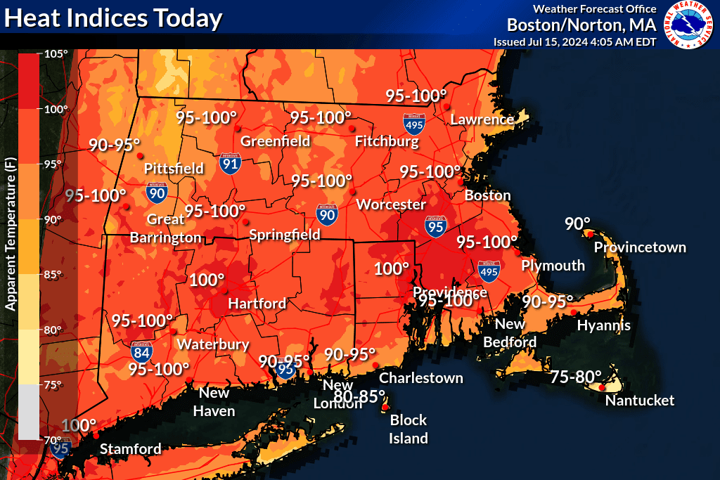 According to the Massachusetts Emergency Management Agency (MEMA), a Heat Advisory will be in effect through Wednesday 7/17 for much of southern New England, including Hingham. Heat index values are expected to range between 95-104 degrees.