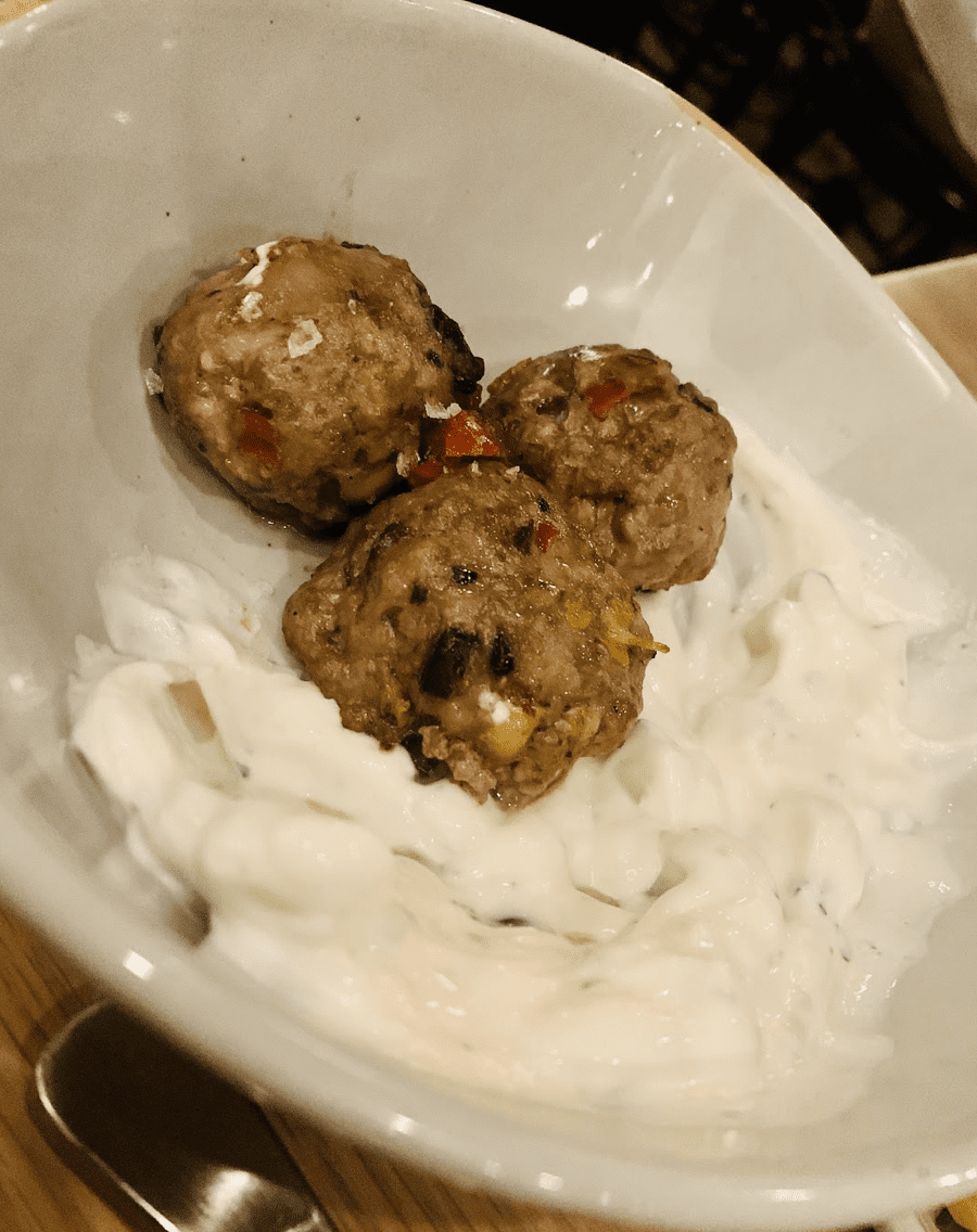 The shareable dishes include a fancy grilled cheese, barbecue pork belly burnt ends, and the Mediterranean lamb meatballs, which were delicious. The meatballs were composed of feta, chickpeas, olives, and red pepper. The thick tzatziki yogurt was the perfect tangy accompaniment to the sweet and flavorful meatballs.