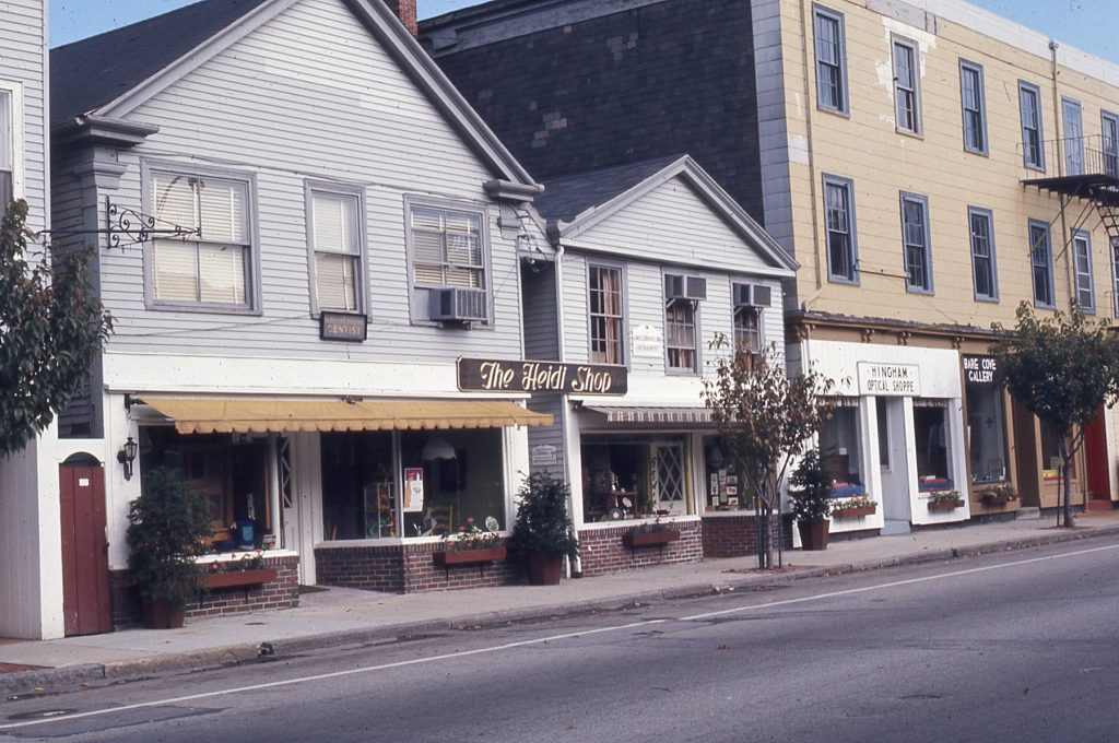 At one time Rizzotto’s Super Market took up two side-by-side shops on South Street in Hingham Square. When they moved up South Street, the Hingham Camera Shop moved in on the left and the Hingham Optical Shoppe on the right. Later The Heidi Shop, owned by Helen Bornheim, moved in on the right from the family business in South Hingham on September 25, 1953. At the time, the Hingham Photo Service was on the left, but Warren Noble bought the business and changed the name to the Hingham Camera Shop. Then when he moved up to the corner, Helen added his space to hers. In the beginning. Helen Bornheim sold the jewelry made by her silversmith father Henry and personally selected most of the gift items and home accessories she sold. The Heidi Shop closed its doors in October of 1997 after doing 44 years of business in Hingham Square. This photo was taken in 1977 by Geri Duff.