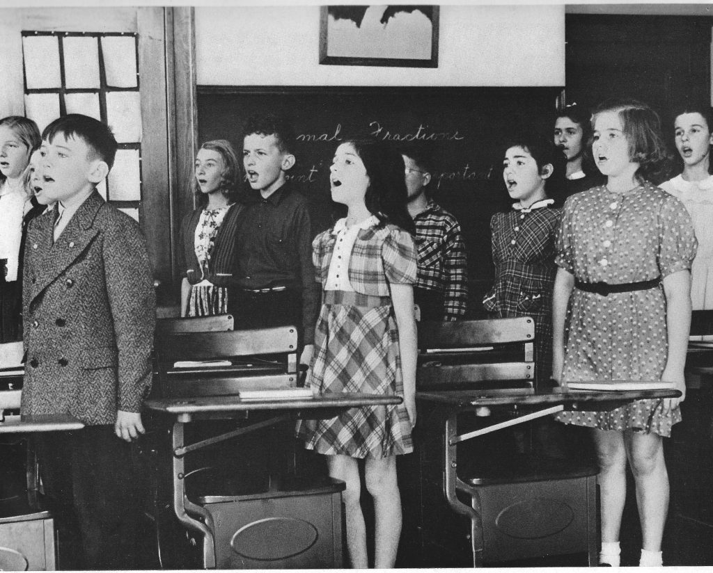 The title is by Eleanor Roosevelt. She gave this caption to Francis Cook Macgregor’s photo of a class in Hingham in 1941. Mrs. Roosevelt went on to describe Hingham’s schools as cheerful and comfortable. This scene is at the West School on Thaxter Street. Val Duff who went to the West School identified the kids shown here. They are Carolyn Pinel, Wilton Whitcomb, Josephine Tedesco, George Seton, Ginny Magnoli, Catherine Zona (now Ruffini), Pauline Geodecke, JoAnn Davis and Bob Magner. Francis Cook Macgregor took the pictures and Eleanor Roosevelt wrote the caption for the book, published in 1942, This is America that promoted the people of America.