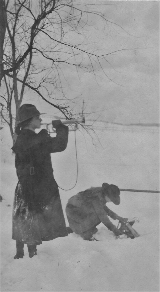 January 20, 1923, the Hingham Girl and Hingham Boys Scouts joined forces and held a Winter Carnival on the Cadet Grounds, now Derby Academy, on Burdett Avenue. About 75 Scouts were present to participate in the 100 yard dash on snowshoes, the 100-yard dash on skis, ski jumping, obstacle race on snowshoes, potato race on snowshoes and sled race. (The races were girls against girls and boys against boys.) After the sports, the Scouts enjoyed hot cocoa and donuts provided by the Hingham Girl Scout Council around a huge bonfire. This photo of a Girl Scout with a bugle and another preparing a small fire is marked “Winifred Brooks” but does not say which one she is. The photo is from the Hingham Girl Scout House Archives.