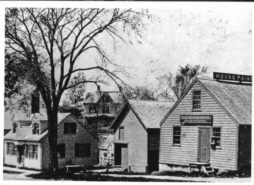 Here is an early view of Pleasant Street looking towards Main Street where you can see the house at #373 Main. The little house to the left belonged to A. Webber in 1903 and the barn and paint shop on the right belonged to C. S. Henderson who lived on Jones Street. Today the little house is still a private residence. The barn and shop are the Downing Cottage Funeral Chapel on Pond Street. One of the few times a building changed addresses without being physically moved. C.S. Henderson, House Painter, used the 513 Pleasant Street address and Downing Cottage Funeral Chapel uses the 21 Pond Street Address. This photo is from the Henderson Scrapbook in the Hingham Historical Society archives.