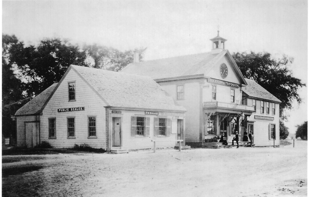 In 1973 Fearing Pratt identified the people in this photo as (L-R) Alice L. and Gertrude I. Fearing, William Fearing II (their dad) and William B. (his son.) The building on the left marked ‘Public Scales’ and ‘Post Office’ is now the Hingham Center Pharmacy. The middle building marked ‘Wm. Fearing’, ‘Groceries and Provisions’ is now Dependable Cleaners. The building on the far right was Loring Jacob’s clothing store for men and boys. William Fearing sold the building to Seth Burr who moved it to the corner of Main and Garrison Road. The land under Jacob’s store was sold to the Town of Hingham and became the second location of the Niagara Firehouse. The photo is in the Hingham historical Society archives.