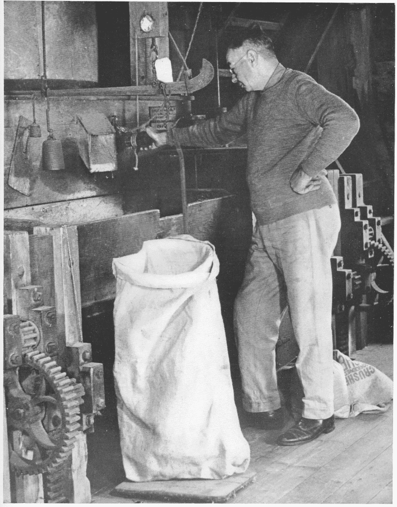 Here is Mr. Robinson preparing to fill a sack with ground corn in the Hingham Grain Mill. The outside of the Hingham Grain Mill has been photographed many times down through the years. So far only a few of the interior have been seen. In 1643 three men, Anthony Eames, Samuel Ward and Bozoan Allen were given permission by the Selectmen to operate a corn mill at the cove. It became one of the oldest mills in the country to operate continuously on the same site. Sometime during the 1940s, the business switched to selling paint and feed. In 1947 the machinery was taken out. The home of Ye Olde Mill Grille for years was in the section closest to North Street, the addition that was added in 1723. Today it is the home of the Liberty Grill. This photo, taken by Francis Cooke Macgregor is from the book “This is America.”