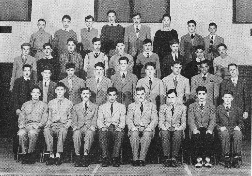 The seven young men sitting in the front row are seniors. The rest of the thirty-two team members are a mix of lower classmen. In 1943 the football team had a season of four wins, two ties and one loss. When you stop for a minute and think that this was in the middle of WWII, they had a good season. Many of these boys were also in the Rescue and Demolition Squad, First Aid and Fire Defense groups that were a part high school life then and many enlisted in the armed forces after graduation.
