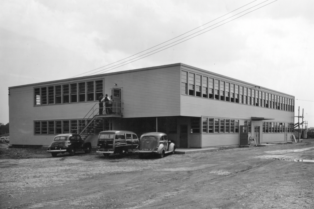 Across Lincoln Street, from the main entrance to the Hingham Shipyard was the Bethlehem-Hingham Shipyard Employment Building. After WWII the Hingham School Department was able to use this building the while construction commenced on new schools for the growing school population. In 1947 all 5th and 6th graders went to North. In 1959 all seventh graders went to North. After the children were moved into the new schools, this building sat empty for a number of years before being torn down in 1981. The 1947 photo is from the Hingham Historical Society, and the 1975 photo is from a series of photos.