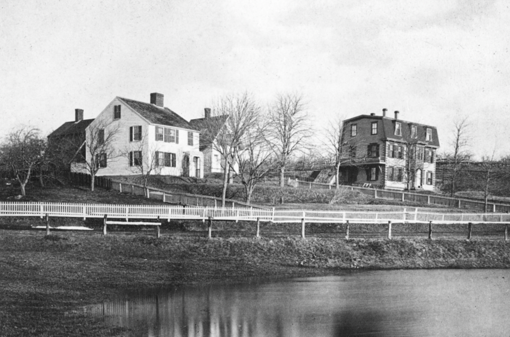 These are the Hudson brothers’ homes, William’s on the left and Augustus’ on the right, at the end of North Street near Beal. Both brothers held patents for photographic improvements but William was the prominent photographer around Hingham and most likely took this picture about 1860. Augustus was a cabinet maker and ornamental painter. It was he who painted the original Torrent Sign over the West Hingham Fire Station and carved the little fireman sitting on top of the sign. The water is the official Town Swamp, now completely overgrown with vegetation. The photo is from the Judy Kimball Collection at the Hingham Historical Society.