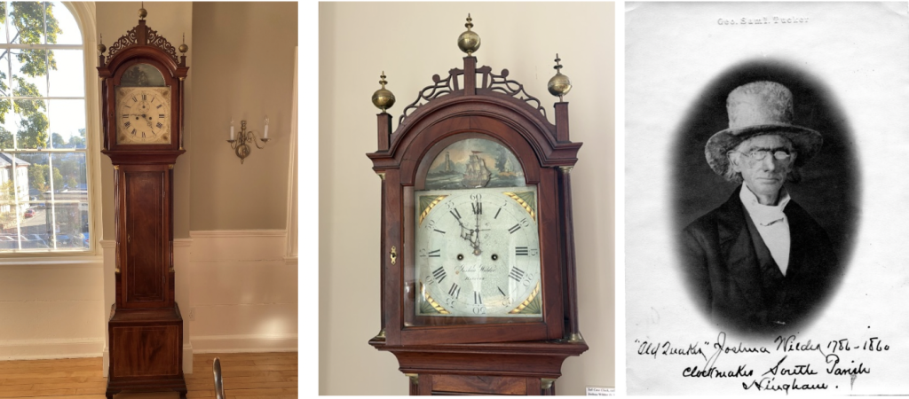 Joshua Wilder was the first clockmaker to settle in Hingham. He was born in Hingham in1786 and aside for a brief time when he lived in Hanover learning the clockmaker’s trade, he spent his life in Hingham at his trade. From 1820 to 1850 he made and repaired clocks, watches and timepieces. He was known for his dwarf clocks and grandfather clocks. He made compasses and had several patents. He sold his pieces in his shop which he advertised as near “Wilder’s Bridge” and lived next door at 605 Main Street. Joshua was called “Old Quaker Wilder” because he would walk from Hingham to Pembroke for Quaker services. Recently a Heritage Museum volunteer I work with came to me all excited that there are four Joshua Wilder clocks in the second floor of the Museum. One clock has a ship that rocks back and forth. They still keep accurate time and are wound on a regular basis.