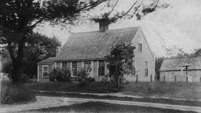 There is a delightful story about the house at 107 Leavitt Street. Built in 1841 by Elijah Souther in a part of town we call “Over the Delaware” this house was painted yellow with white trim. Elijah’s daughter, Rebecca, married a British seaman named James Price who had become shipwrecked off the coast of Hull and chose to stay in this country. When they married, they moved into this cozy little house. Elizabeth Coatsworth, in her book “South Shore Town” tells of meeting one of their elderly daughters still living in the house who told her: “Every fine Sunday morning my father would take the lane going up Turkey Hill and carry his spyglass with him. He liked to watch the passing vessels.” He never went to sea after he married but it is said he was the one who caved the border of grape leaves and vines across the top and on the pillars and either side of the front door, the oak leaves and acorns which are topped with a small eagle with spread wings. This photo is from the Hingham Historical Society Archives.