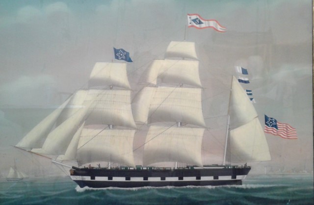 At one time Hingham was home to several shipbuilding yards. In 1637 the town granted Thomas Turner land on the westerly side of the harbor, a spot that was known as Goose Point, for a shipyard. Ships were also built near Hersey’s Wharf, Souther’s Shipyard, Hall’s shipyard and Keen’s Shipyard to name a few. The Barque Saxony was built at one of these. She was owned by Alfred Cushing Hersey, first president of the South Shore Railroad. The master of The Saxony was instrumental in saving lives when the ship Central America went down and he was presented with a telescope in thanks. This is a photograph of a beautiful reverse painting on glass in the Heritage Museum by Petrus Weyts (1799- 1857) that needs to be seen to be appreciated. The photo and painting are in the Hingham Heritage Museum.