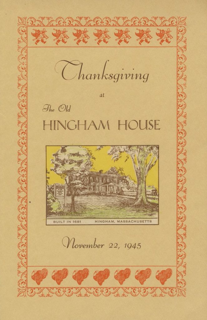 Originally the home of Matthew Whiton, the house at 421 Main Street, Cole Corner, was at different times, a restaurant, a food and pastry shop, and a gift and sweet shop. On November 22, 1945, the Thanksgiving dinner menu offered Roast Native Turkey with Sage Dressing, Giblet Gravy, Cranberry Sauce, Steamed Butternut Squash, Boiled Onions, Green Beans, Asparagus and Whipped Potatoes as the main course. Starters included Fresh Fruit Cup with Sherbet, Fruit Juice Frappe, Fresh Crabmeat Cocktail, Hingham House Cheese Spread and Saltines, Oyster Bisque, Chicken Gumbo Soup, Boston Market Celery and Assorted Olives. Desert was Mincemeat, Pumpkin or Deep-Dish Apple Pie, Baked Indian Pudding with Ice Cream, Meringue Shells with Ice Cream and Sherbet. Beverages included Coffee, Tea, Cider and Milk. Town Records show the house was built in 1739, but the menu states it was built in 1681. As with many houses in Hingham this one has weathered many changes and perhaps additions or changes caused the date difference. In 1867 there was a massive bolt of lightning so severe it blew a hole in the roof and cracked the chimney and then knocked down a horse in the barn. In 1896, when the electric trolley tracks were laid in front of the house, the owners had the house moved back from the roadway because the trolley made too much noise going past. Today it is a lovely private home. The menu comes from the collection of the Hingham Historical Society.