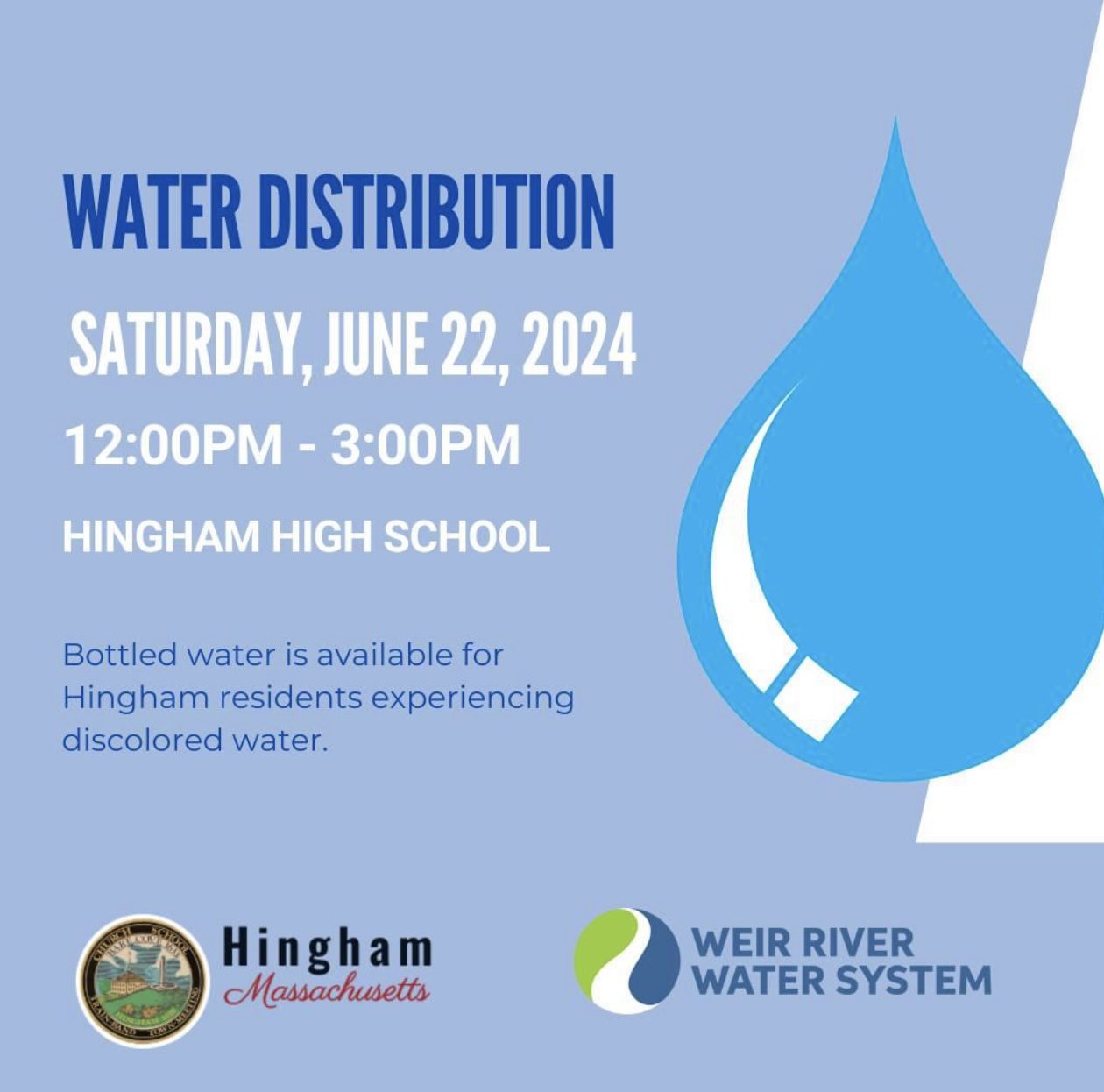 Weir River Water Systems is providing two 1-gallon bottles of water to Hingham residents who need them at the High School on June 21st from 5pm-8pm. A second distribution will occur on Saturday, June 22 from 12-3.