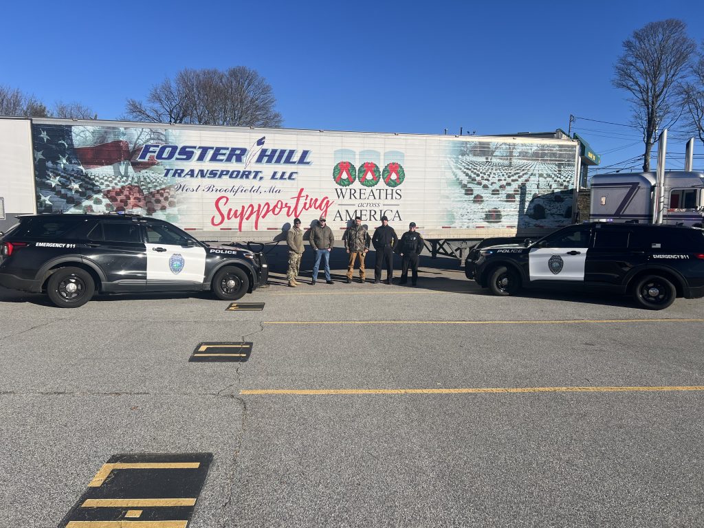 Volunteers from the Hingham Police Department help unload 780 wreaths to support the Wreaths Across America Program (WAA).